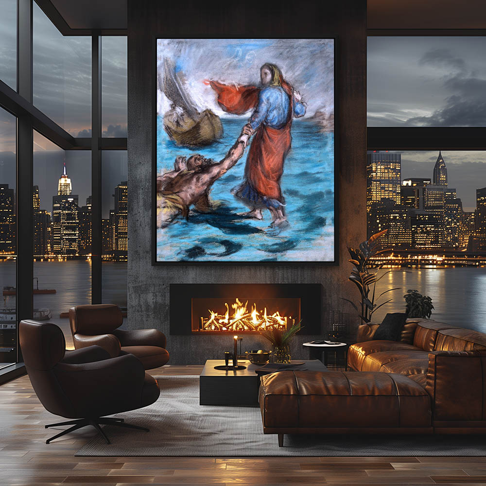 Vintage Religious Painting of the Biblical Figure Jesus Christ Walking on Water