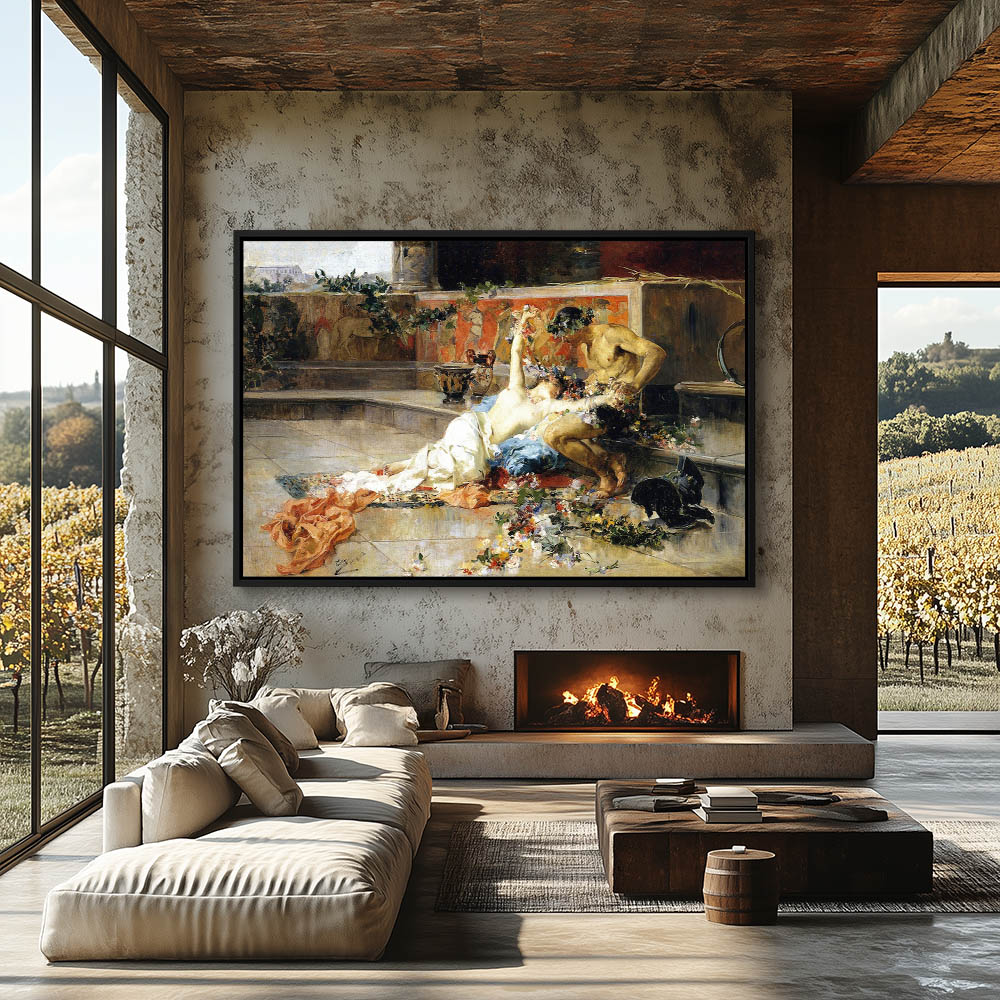Female nude lounging with a shirtless gladiator who’s helmet has been replaced by a floral crown