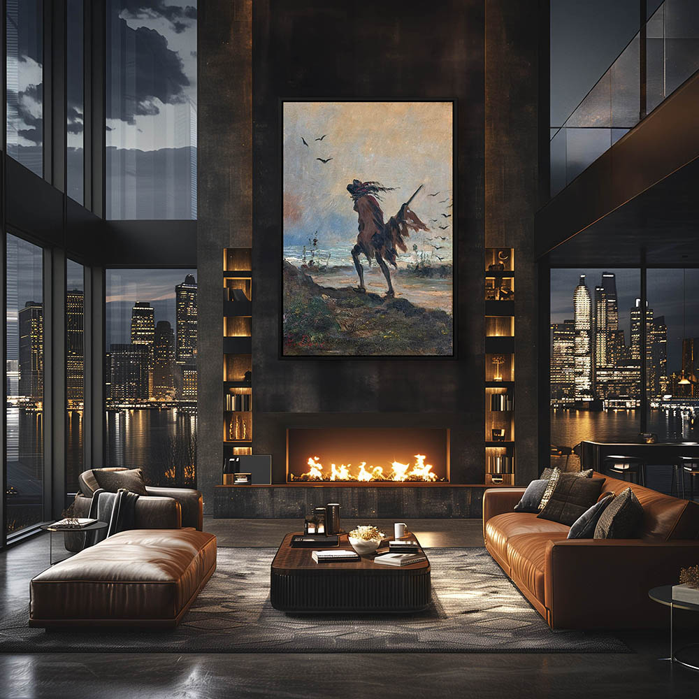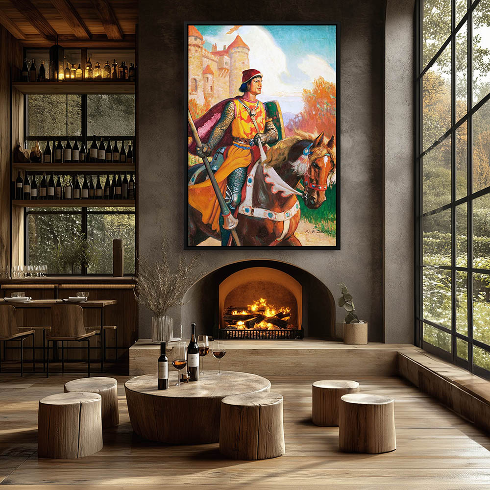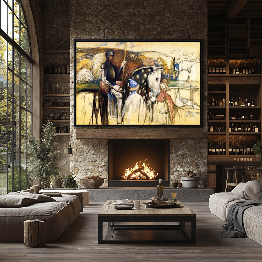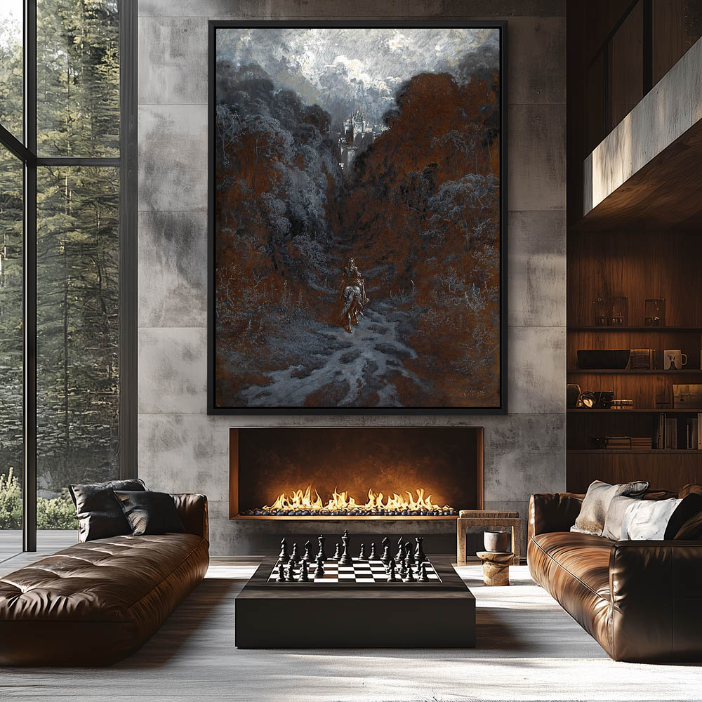 Figurative Painting of a Knight on Horseback Leaving the Castle