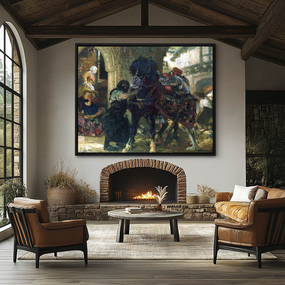 Vintage Figurative Painting of a Knight with a Horse in the Smithy