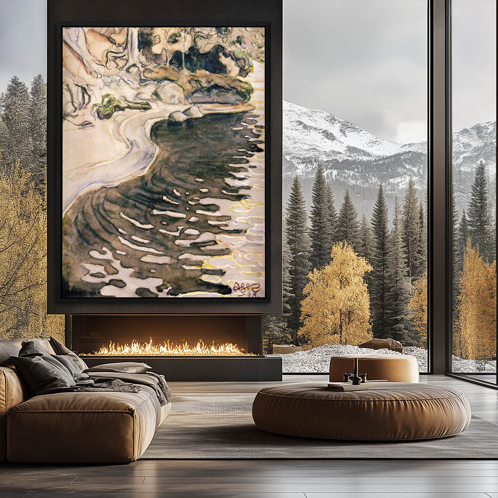 Landscape Painting with a Cabin on the Lake and a Woman watching the Sunset