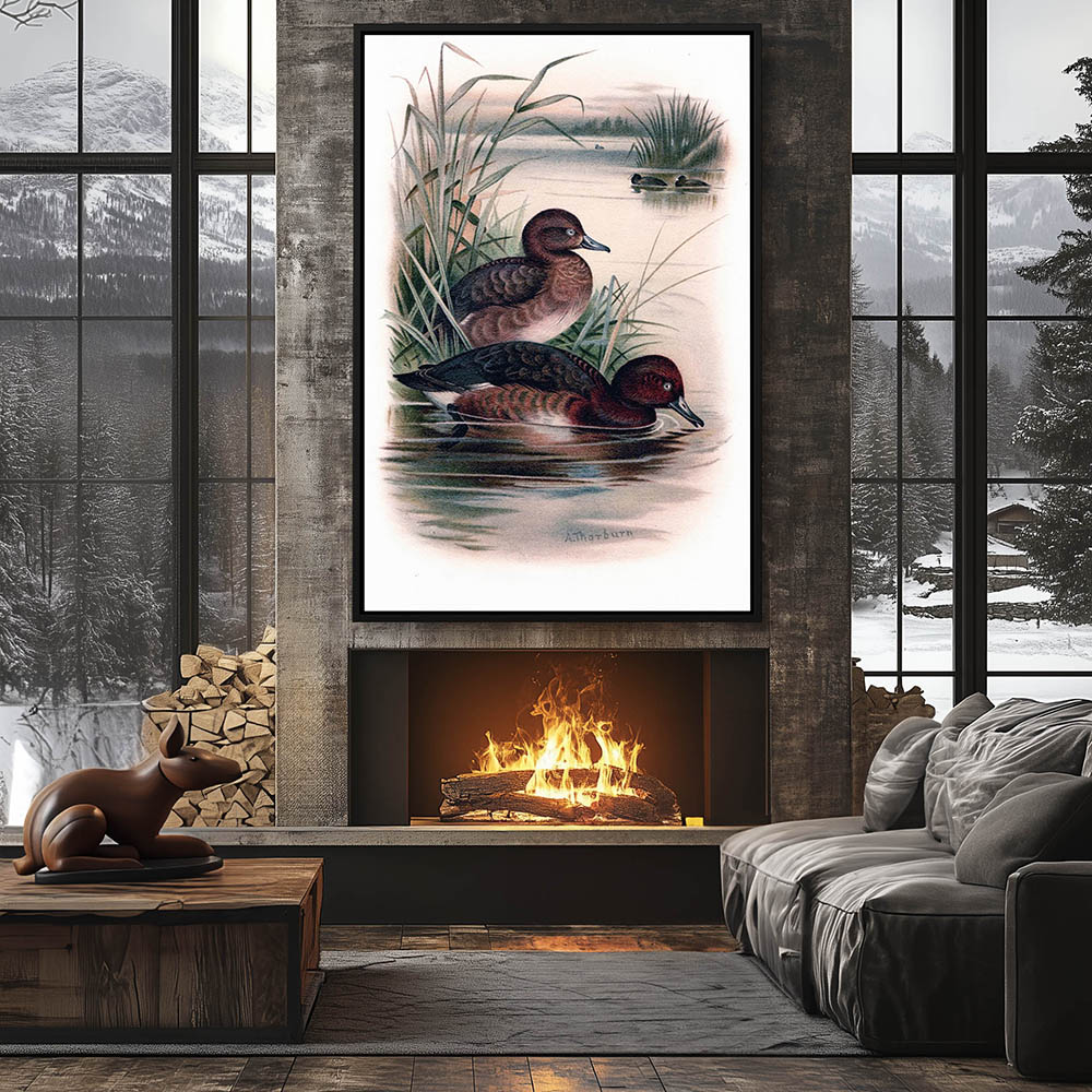 Painting of White Eyed Pochards Ducks in the Water Next to the Reeds
