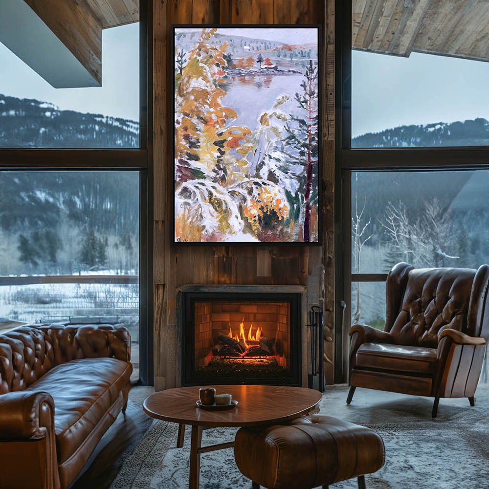 Landscape Painting of a Mountain with Snow and Trees and a View of a Lake