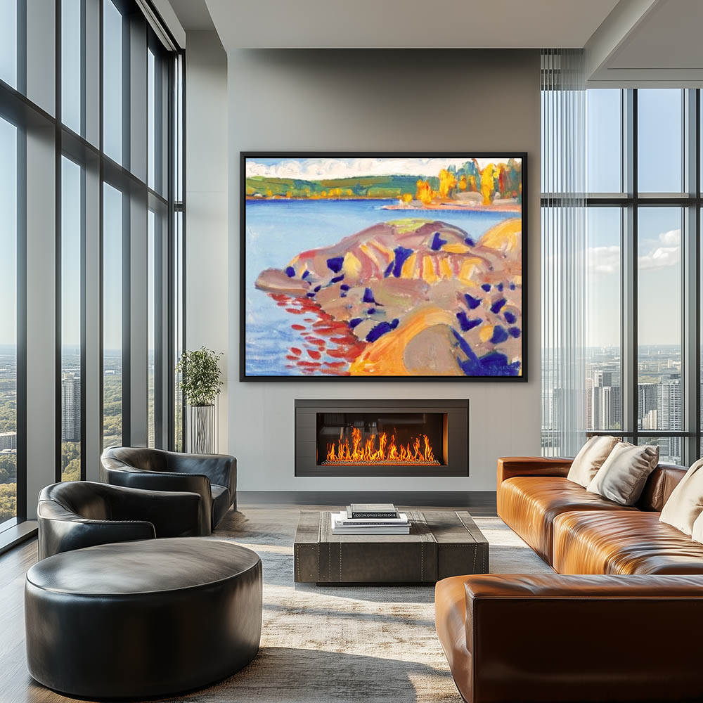Abstract Landscape Painting with a Lake View and Rocks on Shore