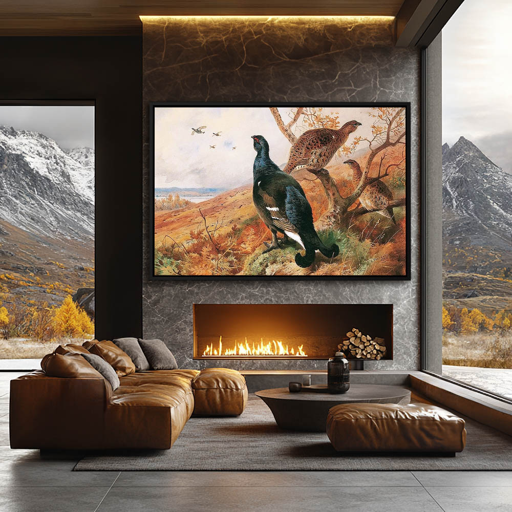 Painting of Blackgame Gamebirds in an Open Landscape Resting in a Small Tree
