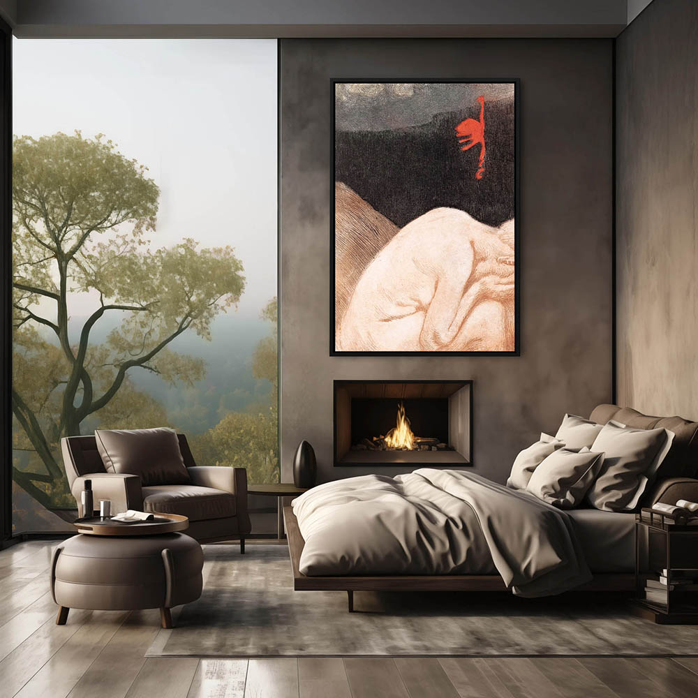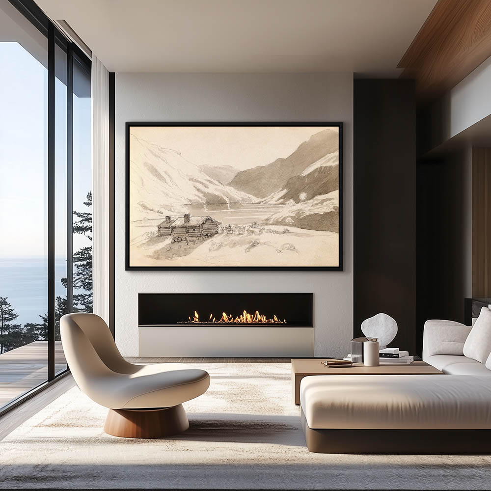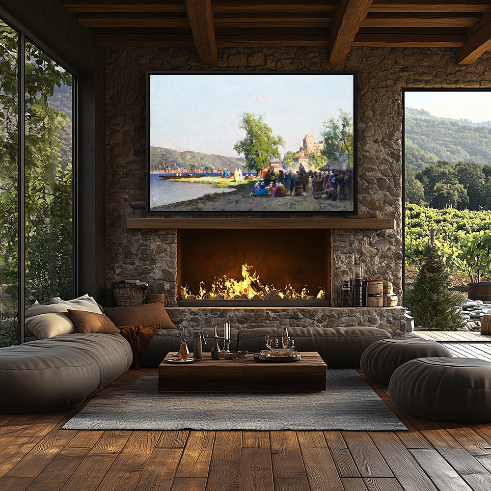 Landscape Painting of a Man by the Fire on the Lake Shore