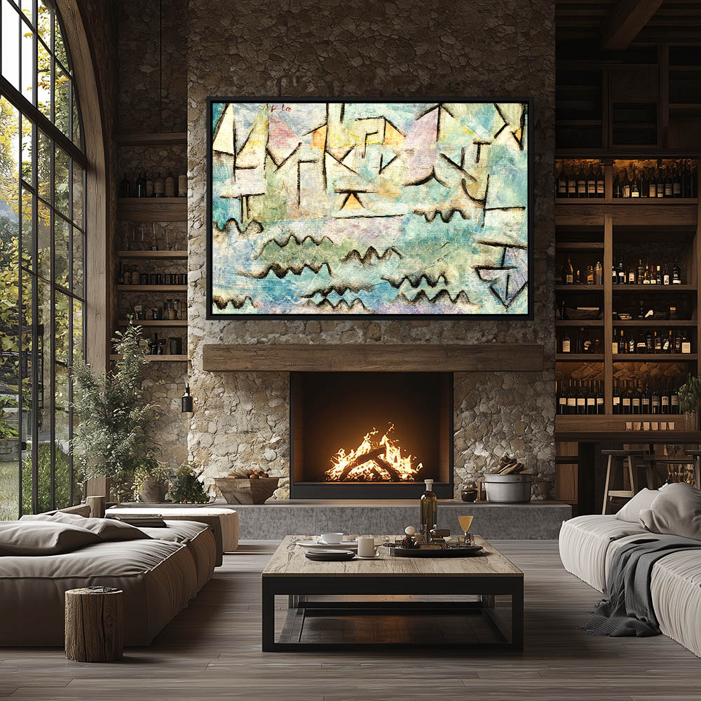 Abstract river scene on multicolored background
