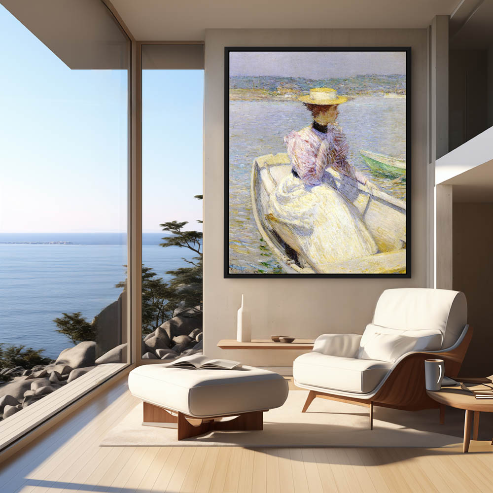 Woman in a hat in a white row boat