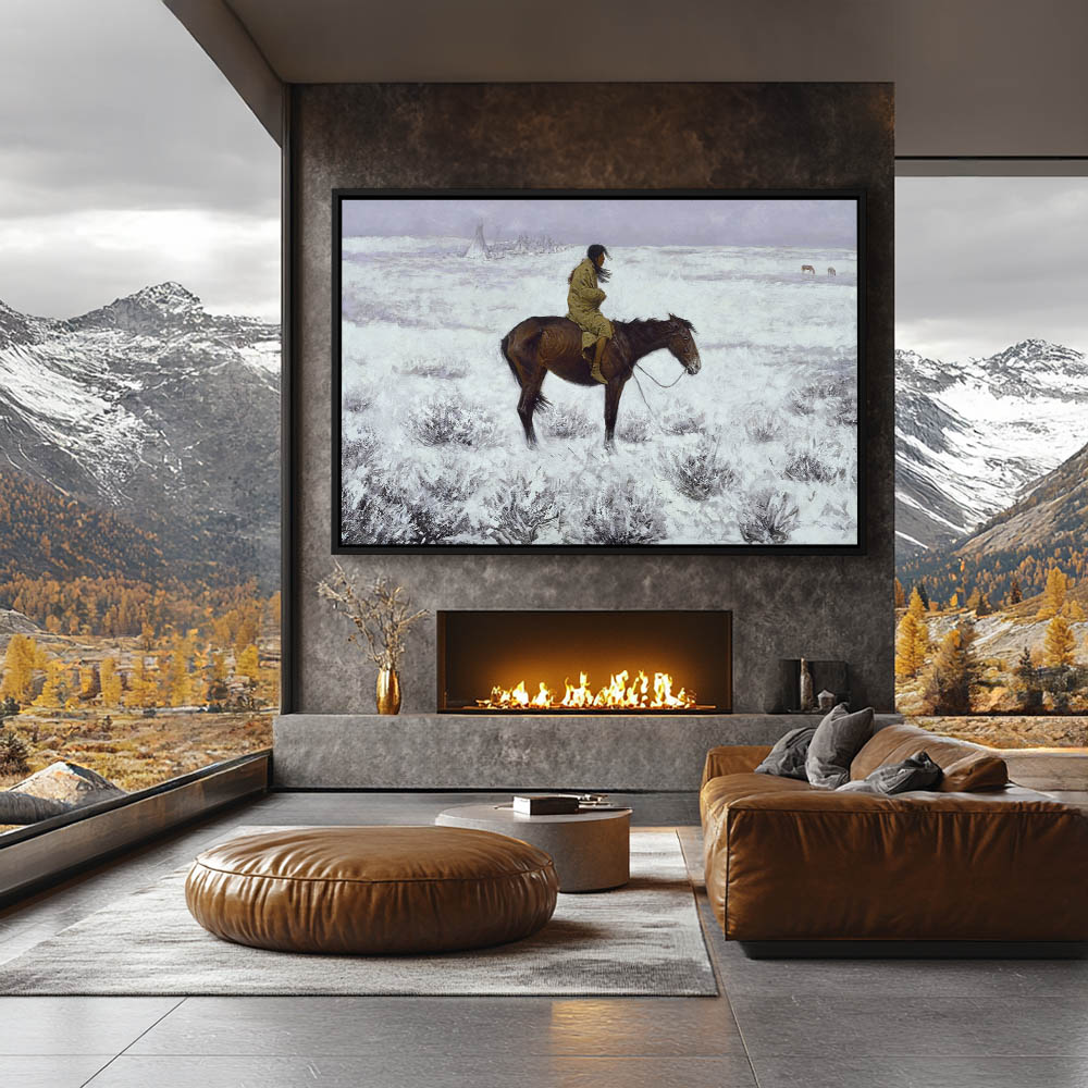 Indian on horseback, bundled against the wind and cold, in a snowy landscape, keeping watch