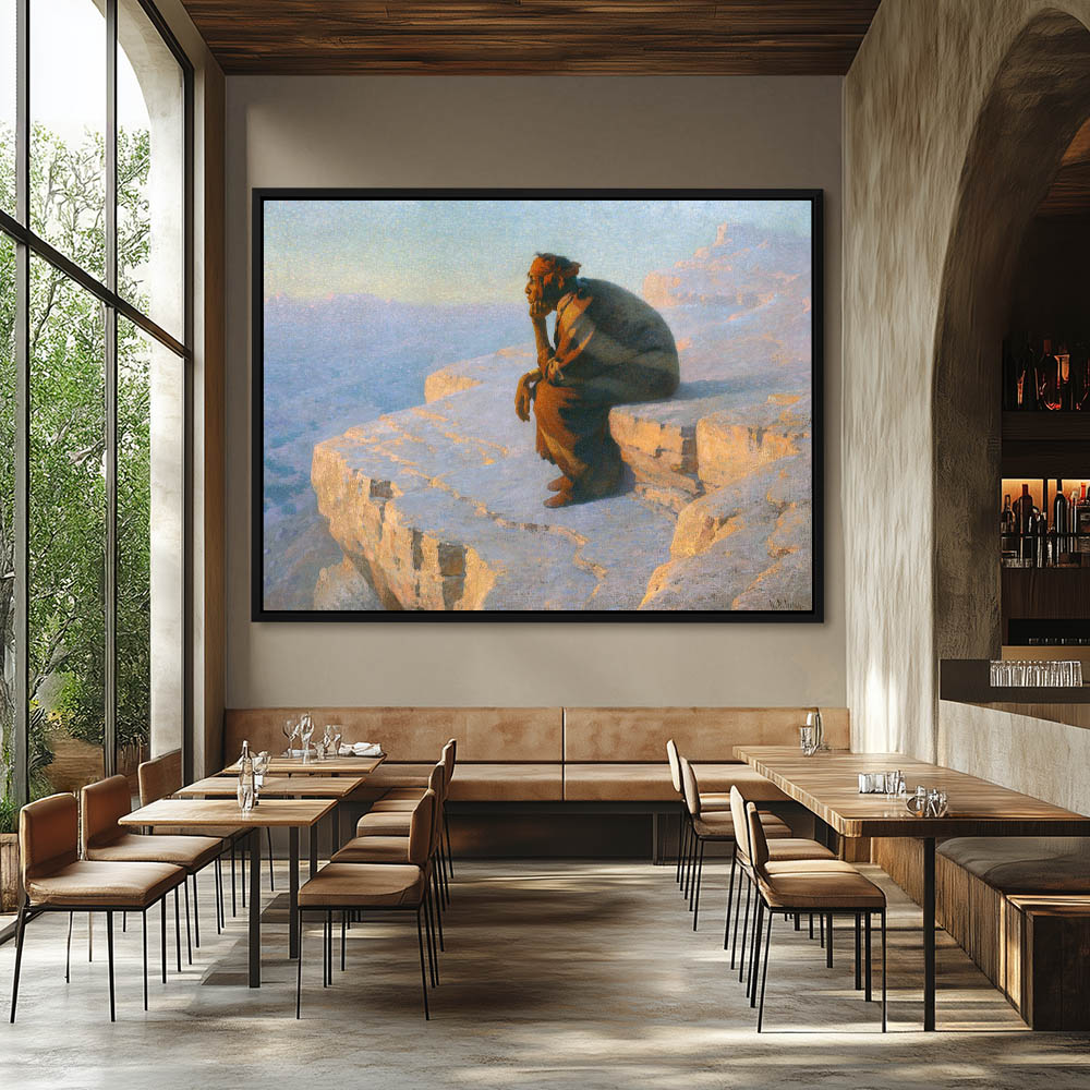 Indian sitting on a ledge looking out over the canyon below