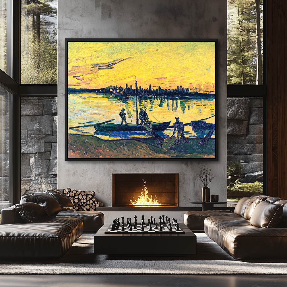 Impressionist Abstract Landscape Painting of Seascape with Figures in Boats at Shore