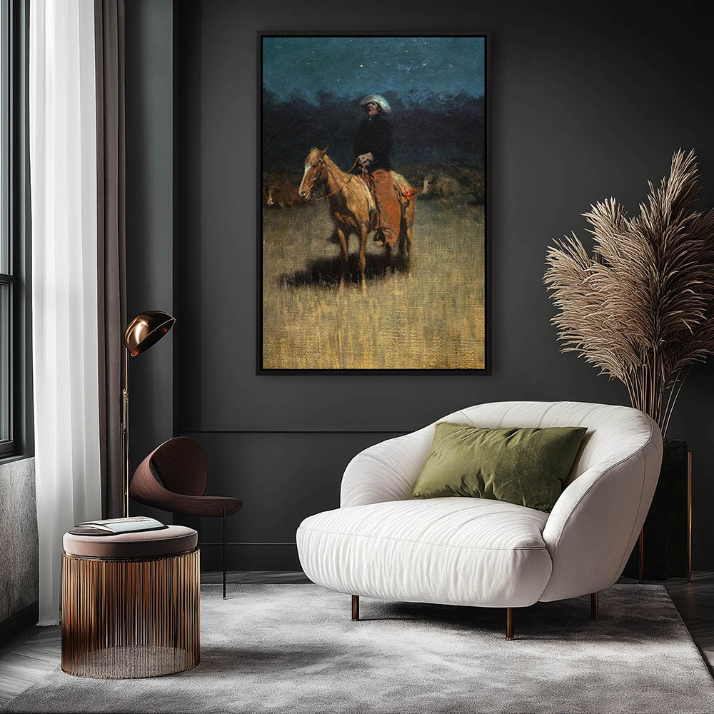 Cowboy on horseback singing at night while on patrol in the cattle herd