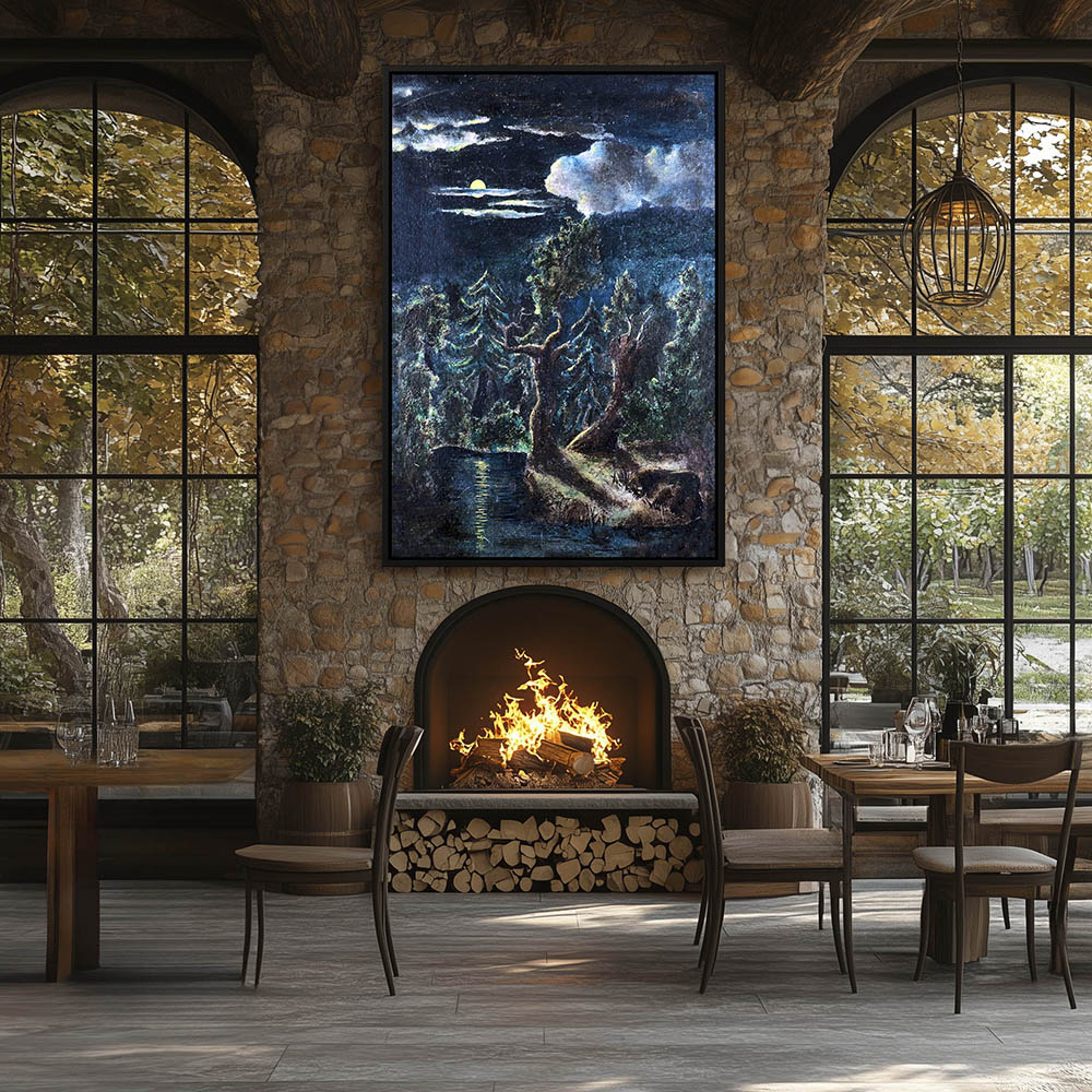 Abstract Landscape Painting of the Forest at Night under the Moon Light