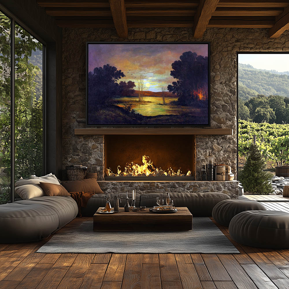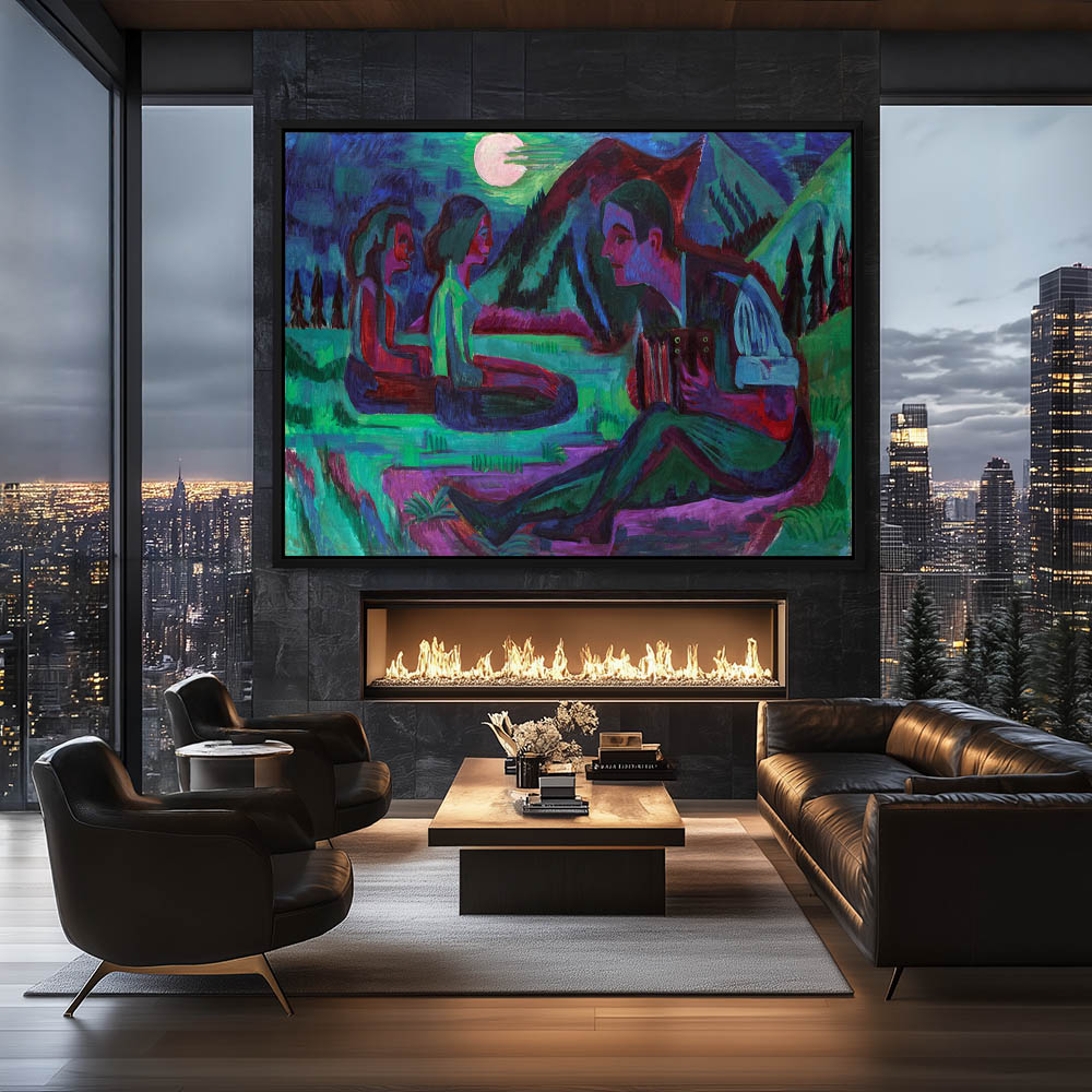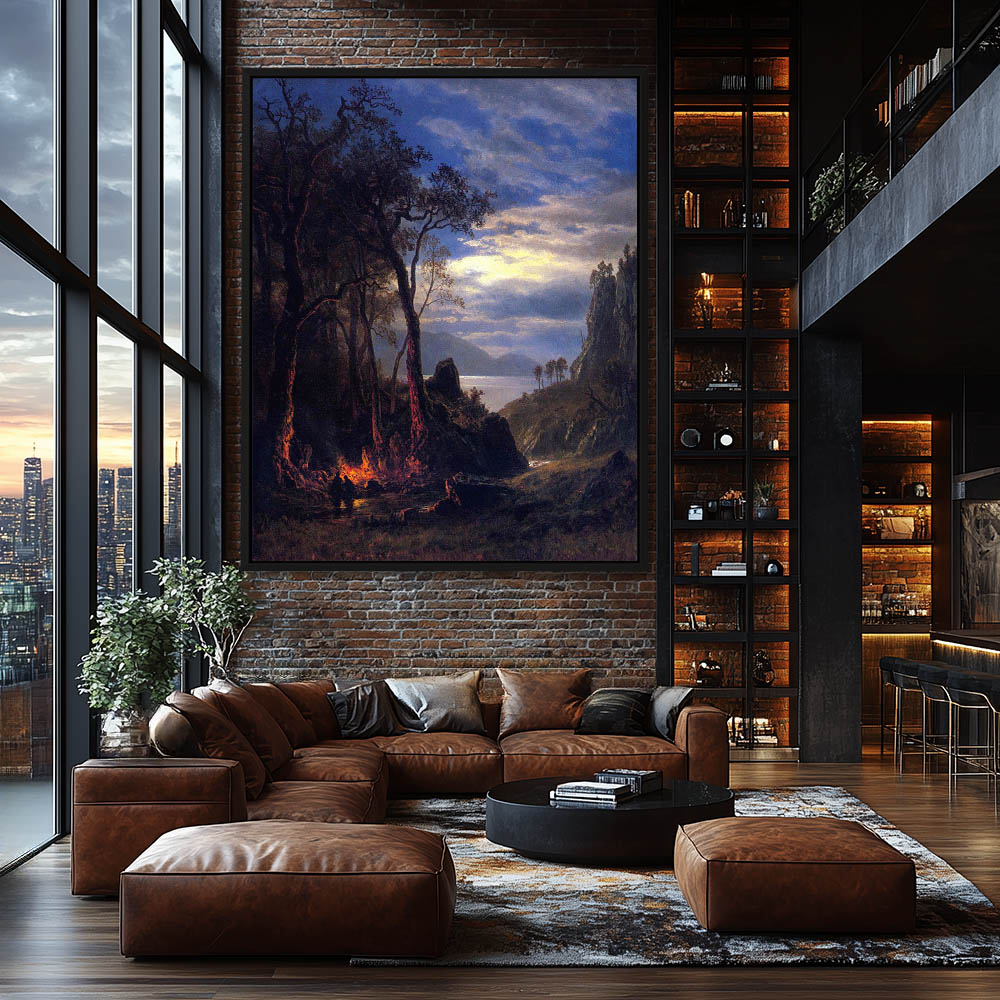 Landscape Painting at Night under Moonlight with Campfire