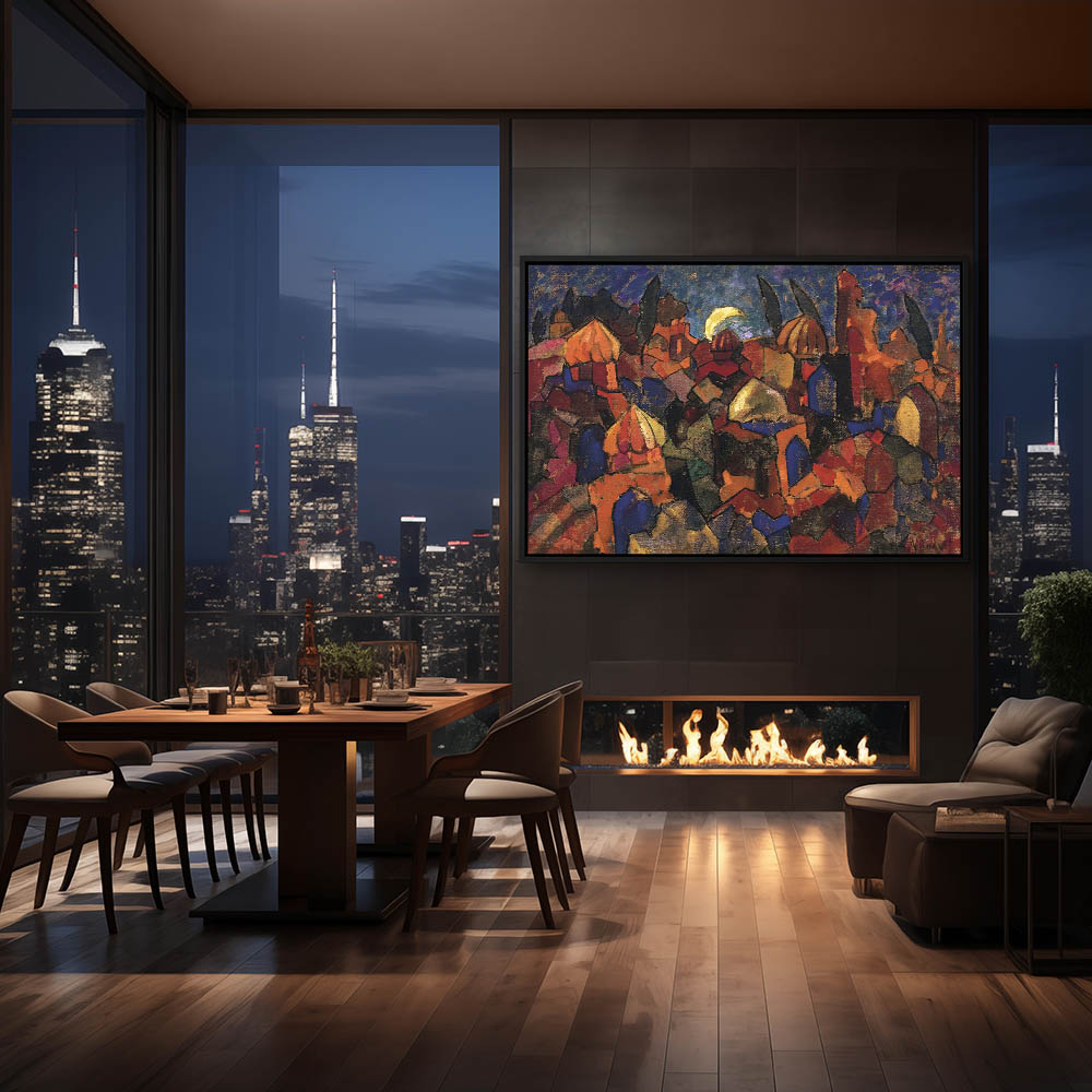 Abstract Landscape Painting of a Village with the Moonshining
