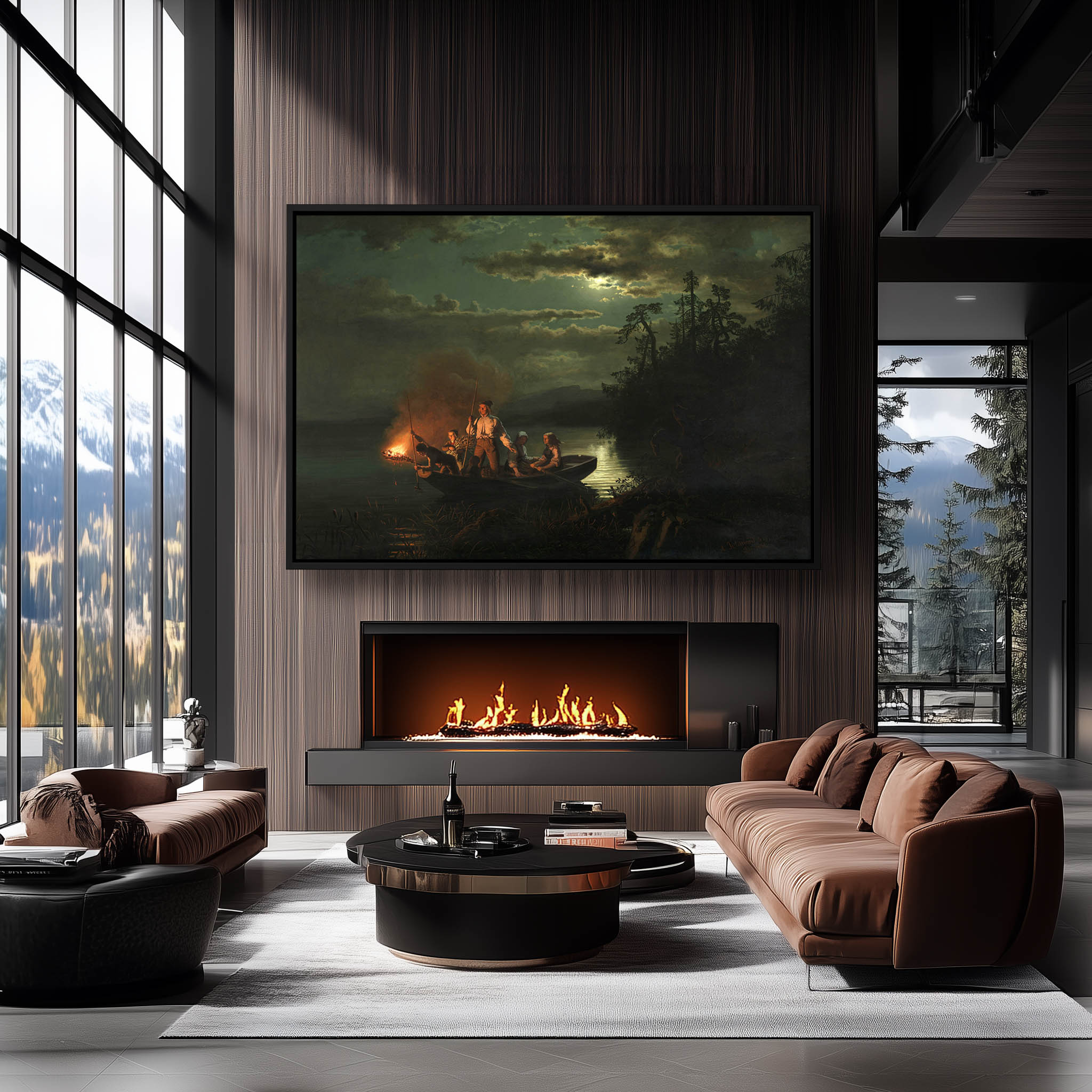Night scene of men in a row boat fishing by the light of the moon and a torch