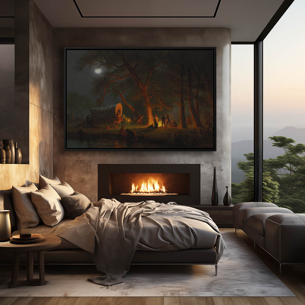 Wagon train camped for the night under a full moon. Men are gathered around the glow of a campfire and bedrolls are laid out around the wagon with For Oregon written on the side.