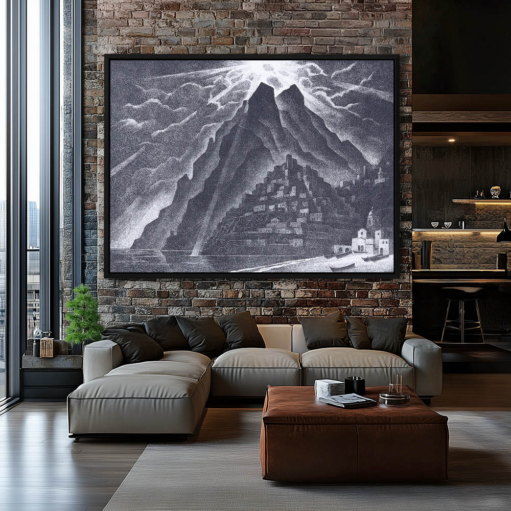 From $29.97Landscape Lithograph with a Mountain and a Village on the Sea Shore in Black and White