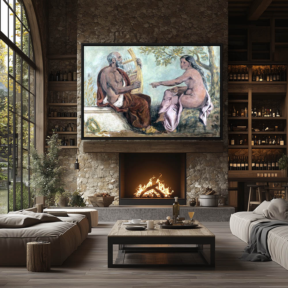 Vintage Figurative Painting with a Man Playing a Harp to a Nude Woman