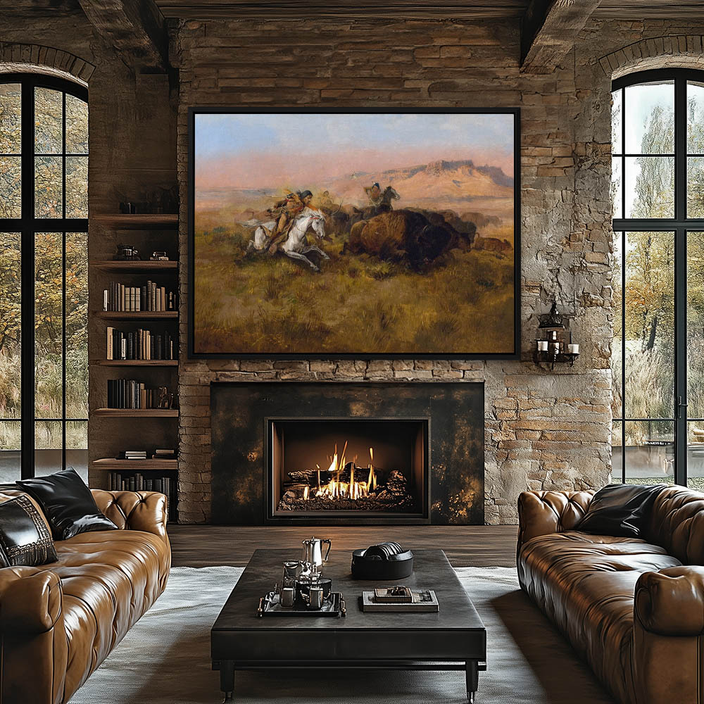 Indians on horseback hunting buffalo