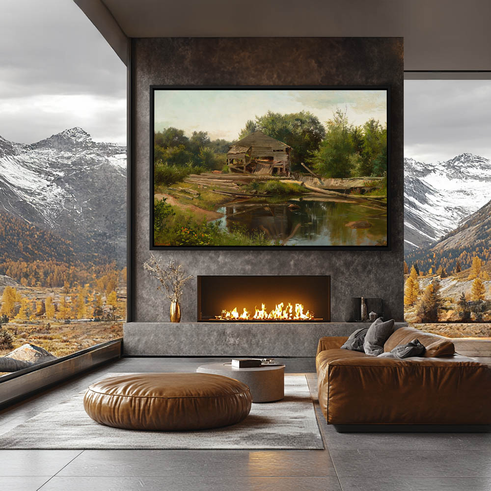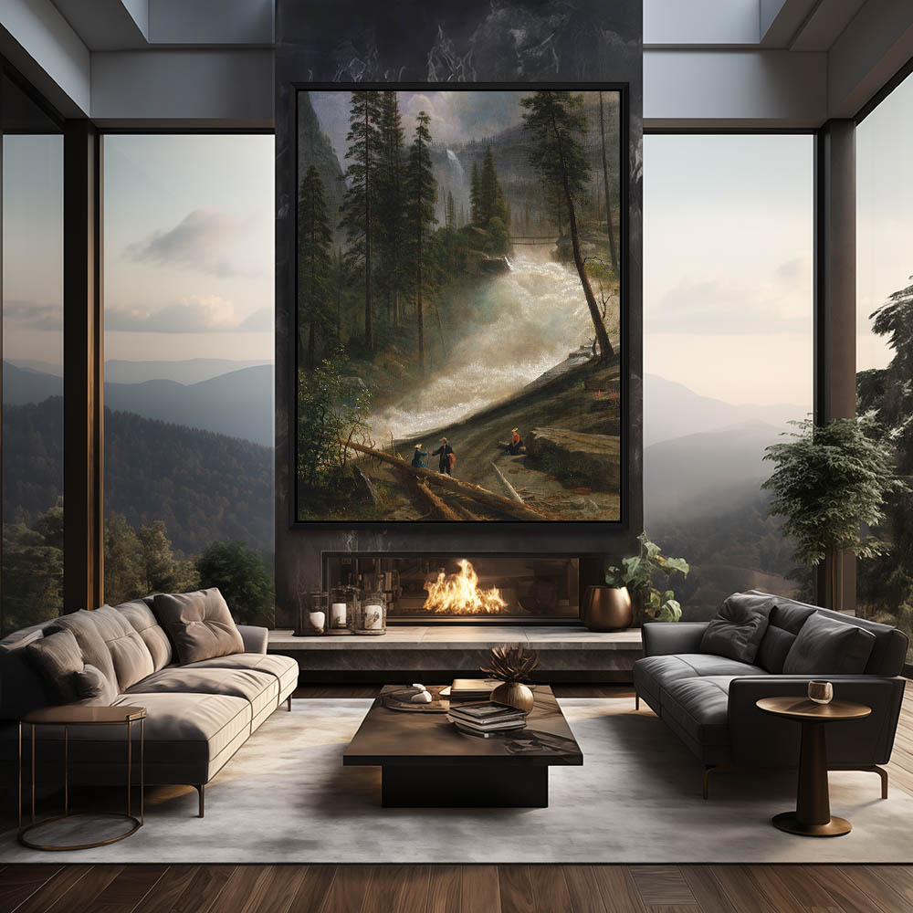 River with waterfalls cutting it’s way through a forest. Figures at the shoreline and on a footbridge in the distance.