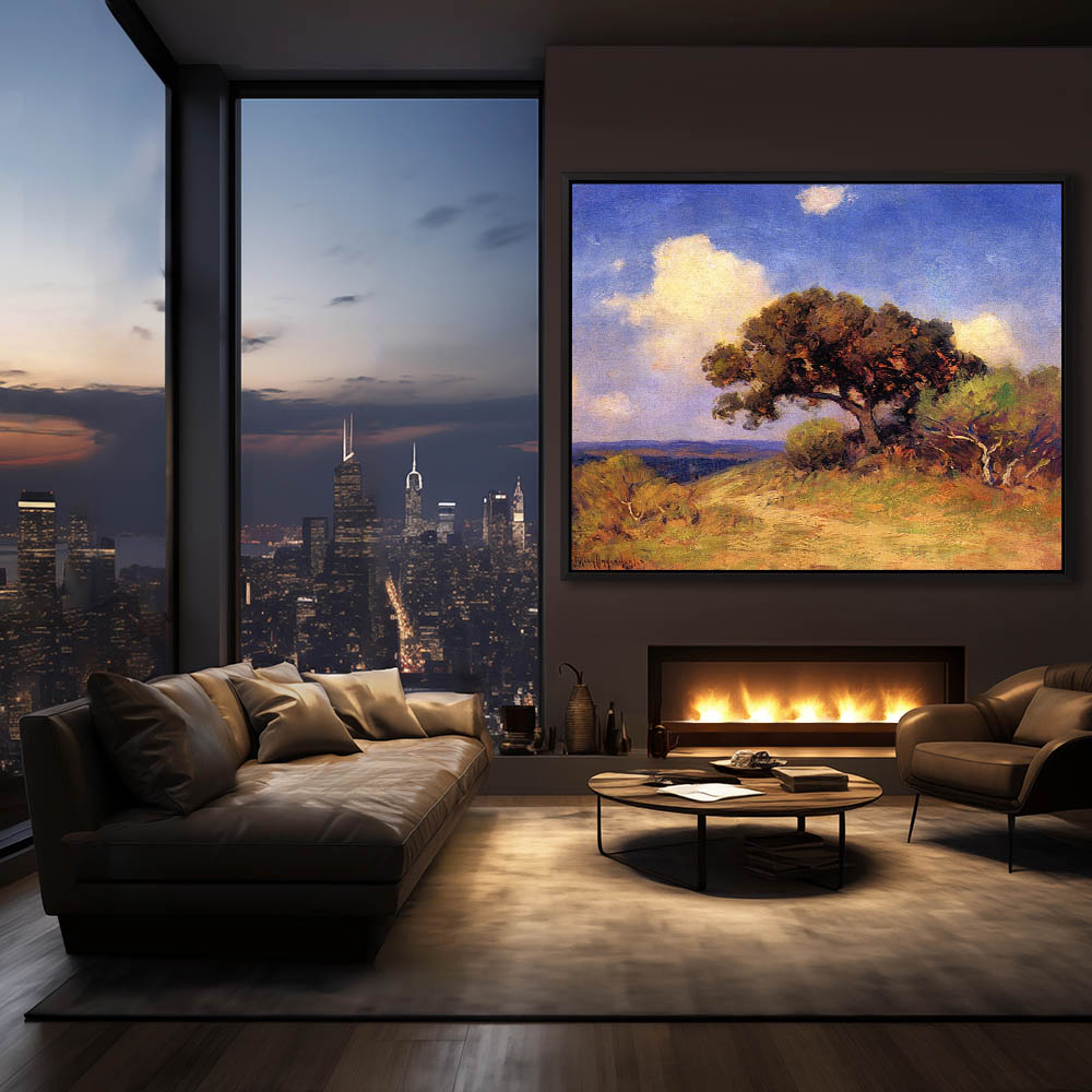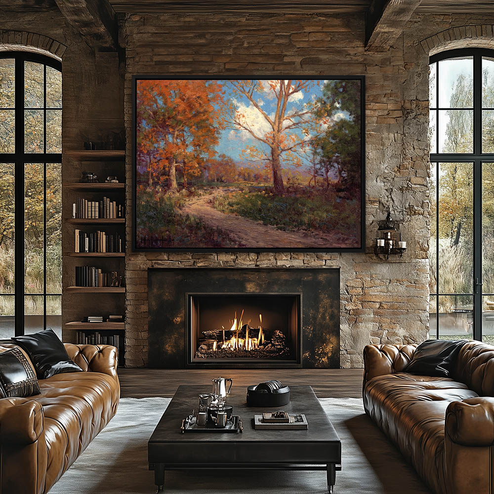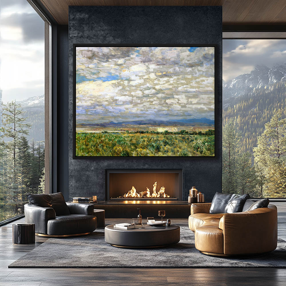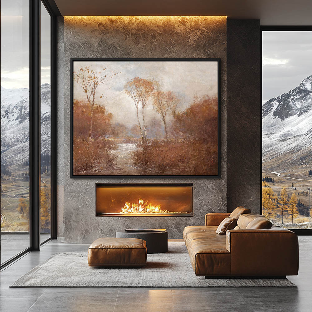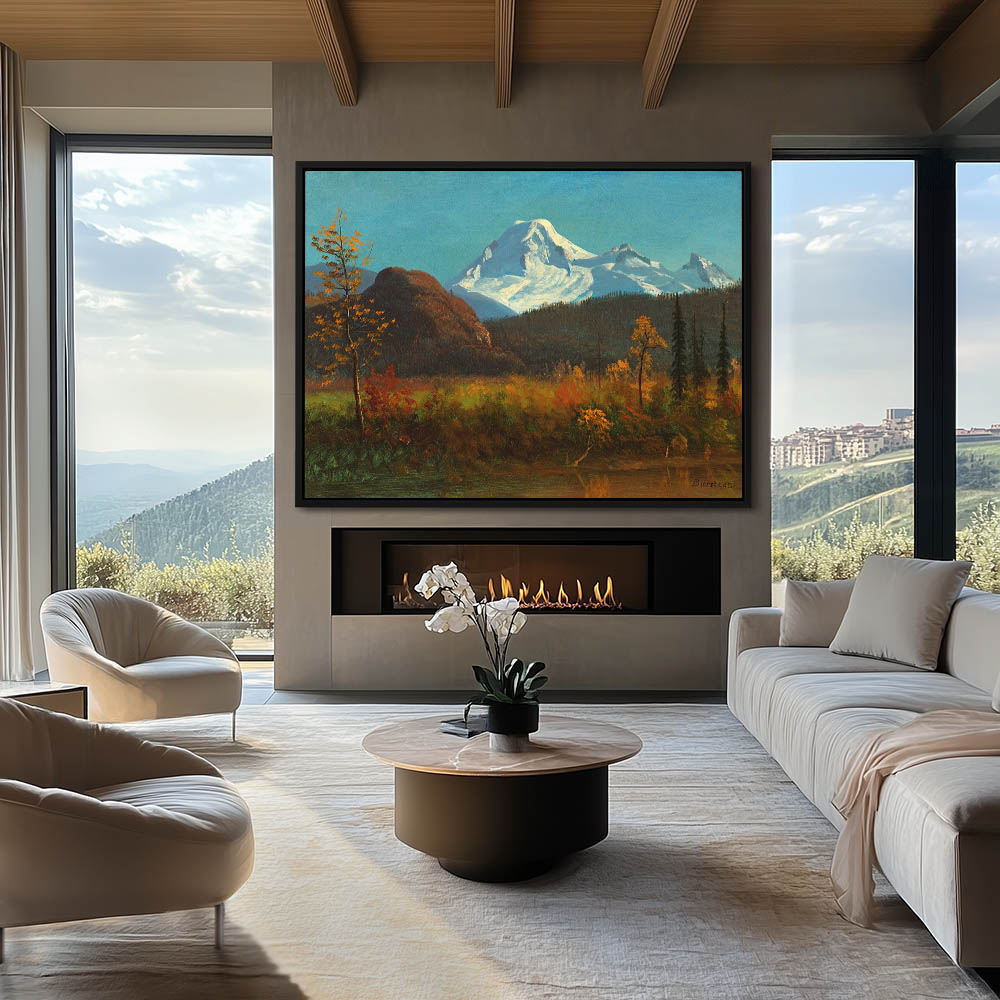 Autumn landscape with snowcapped mountain in the distance beyond foreested hills, grassy meadows and a tree lined river