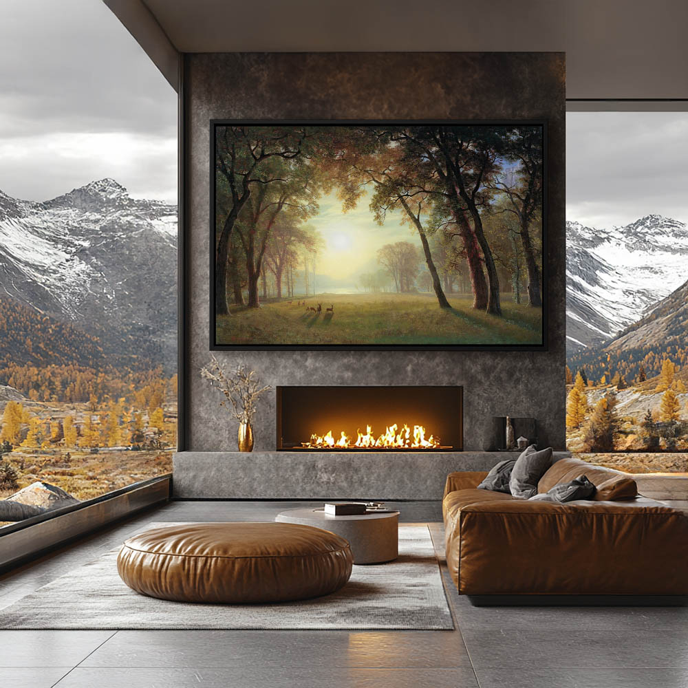 Deer in a forest clearing at sunrise