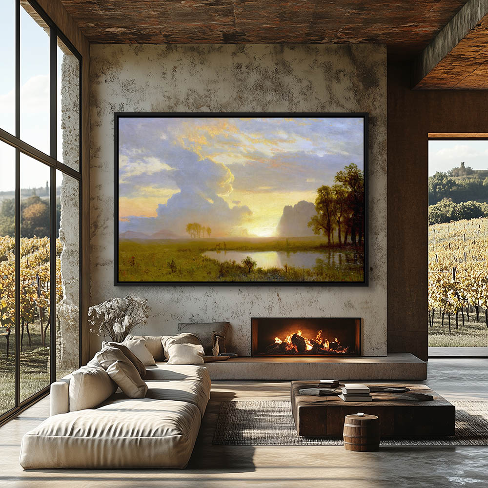 Sunrise silhouetting deer at the water edge on an open meadow