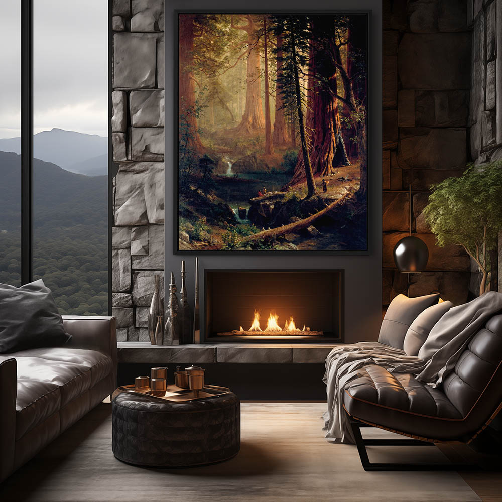 Forest scene with giant redwood trees and Native Americans living in the hollow of the giant trees along a river