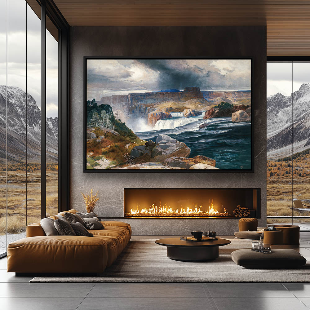 Mountainous landscape with large river and waterfall