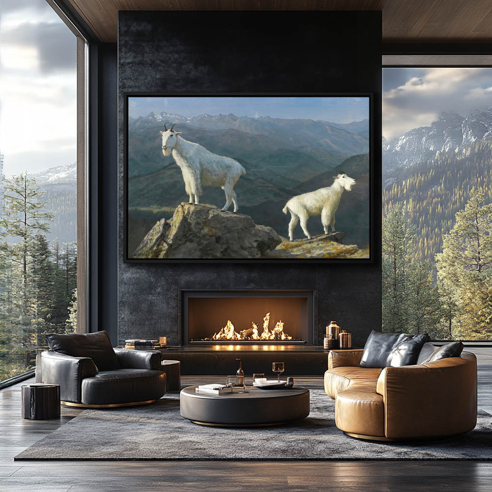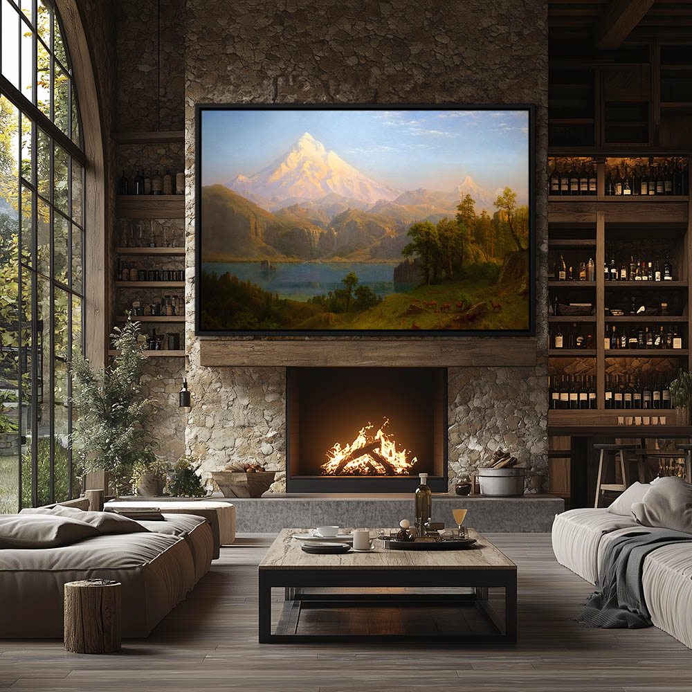 Deer grazing beside a lake fed by the waterfall on the far side leading to the mountain range and Mount Hood rising on the horizon