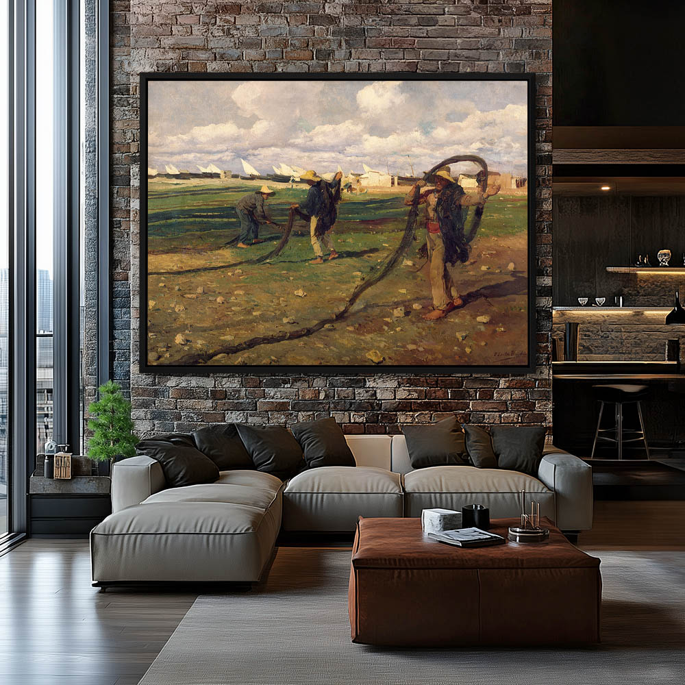 Figures laying out fishing nets and fishing boats coming ashore as the sun sets across the sea