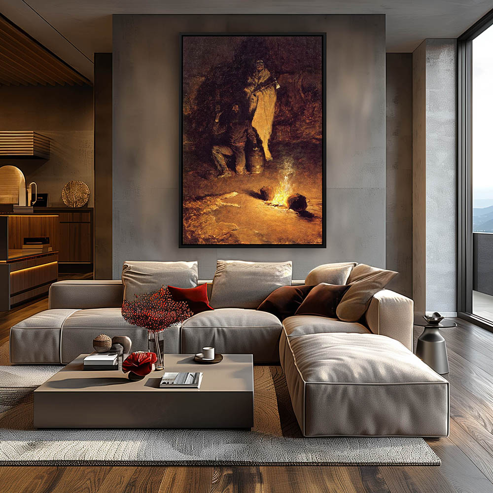 Whiskey trader and his large Indian lit by campfire with heavy shadows on a rocky cave wall