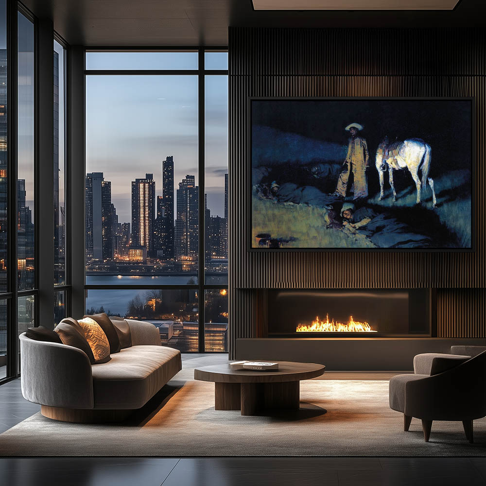 Indian lookout on horseback in a snowy winter landscape inspecting figures on the horizon