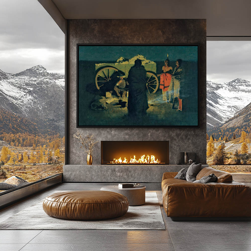 Indians and cowboy around the wagon side campfire, each holding a rifle
