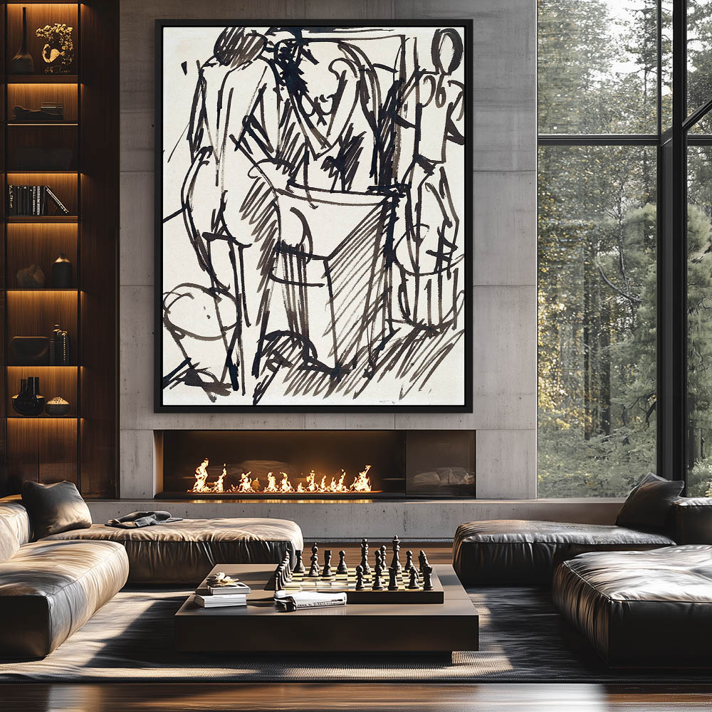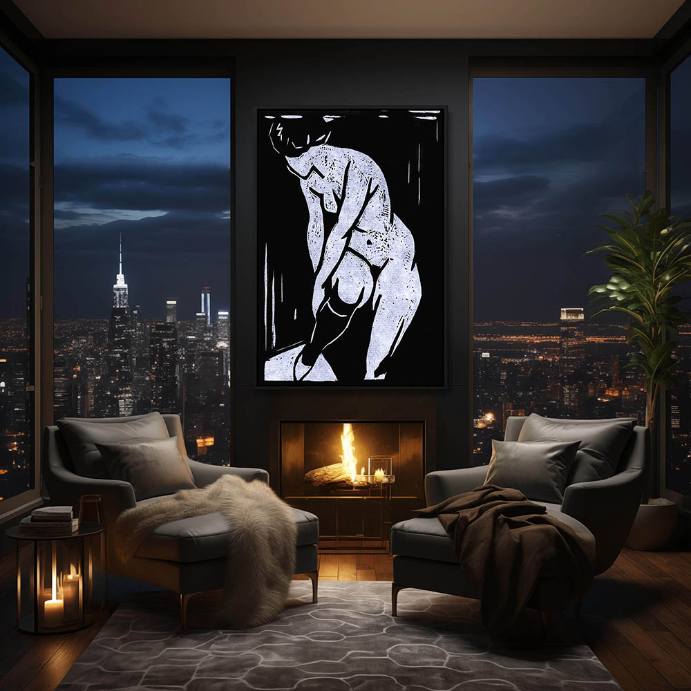 Abstract Figurative Lithograph of a Nude Woman Ajusting Her Garter in Black and White