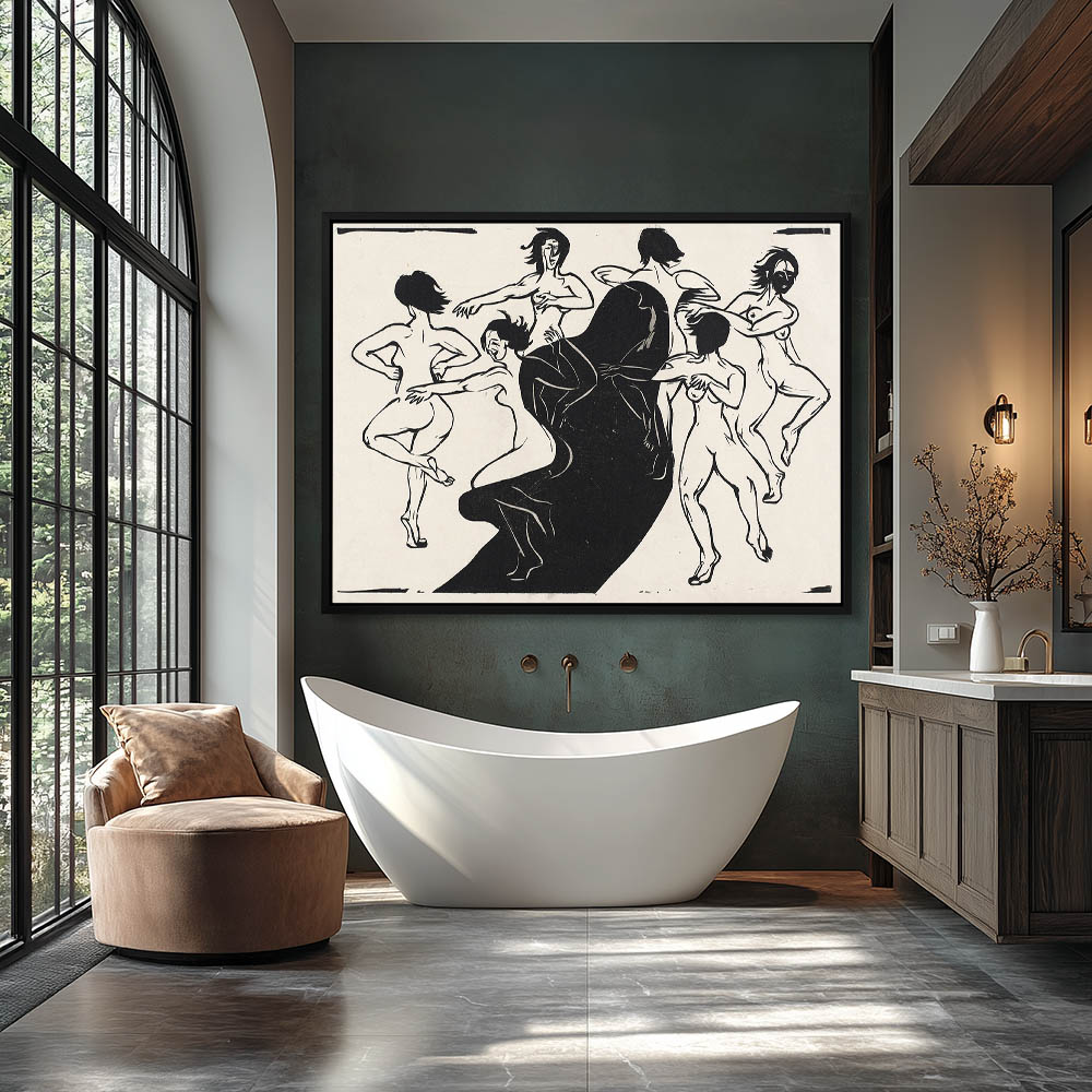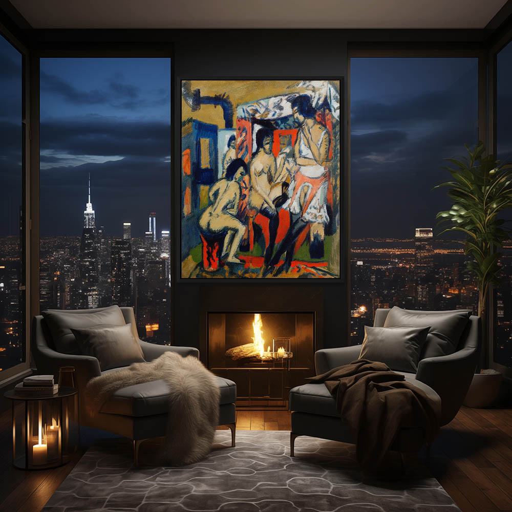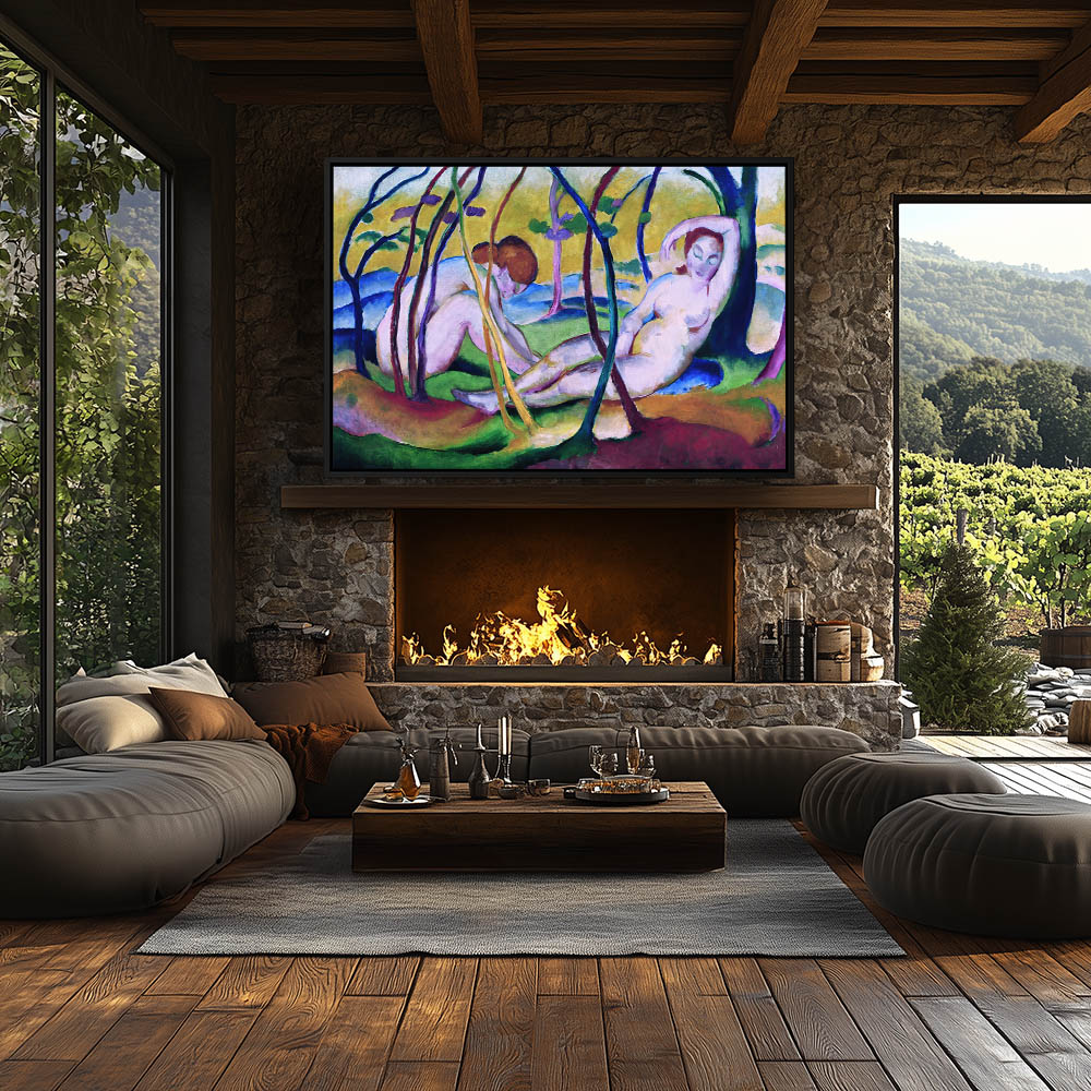 Figurative Painting with Nude Females Bathing in the Lake