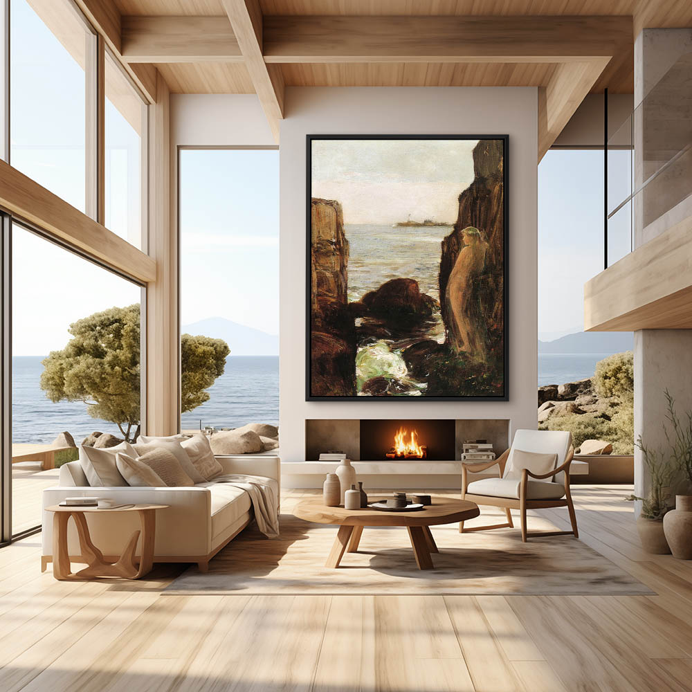 Nude figure on a rocky ledge looking out over the sea