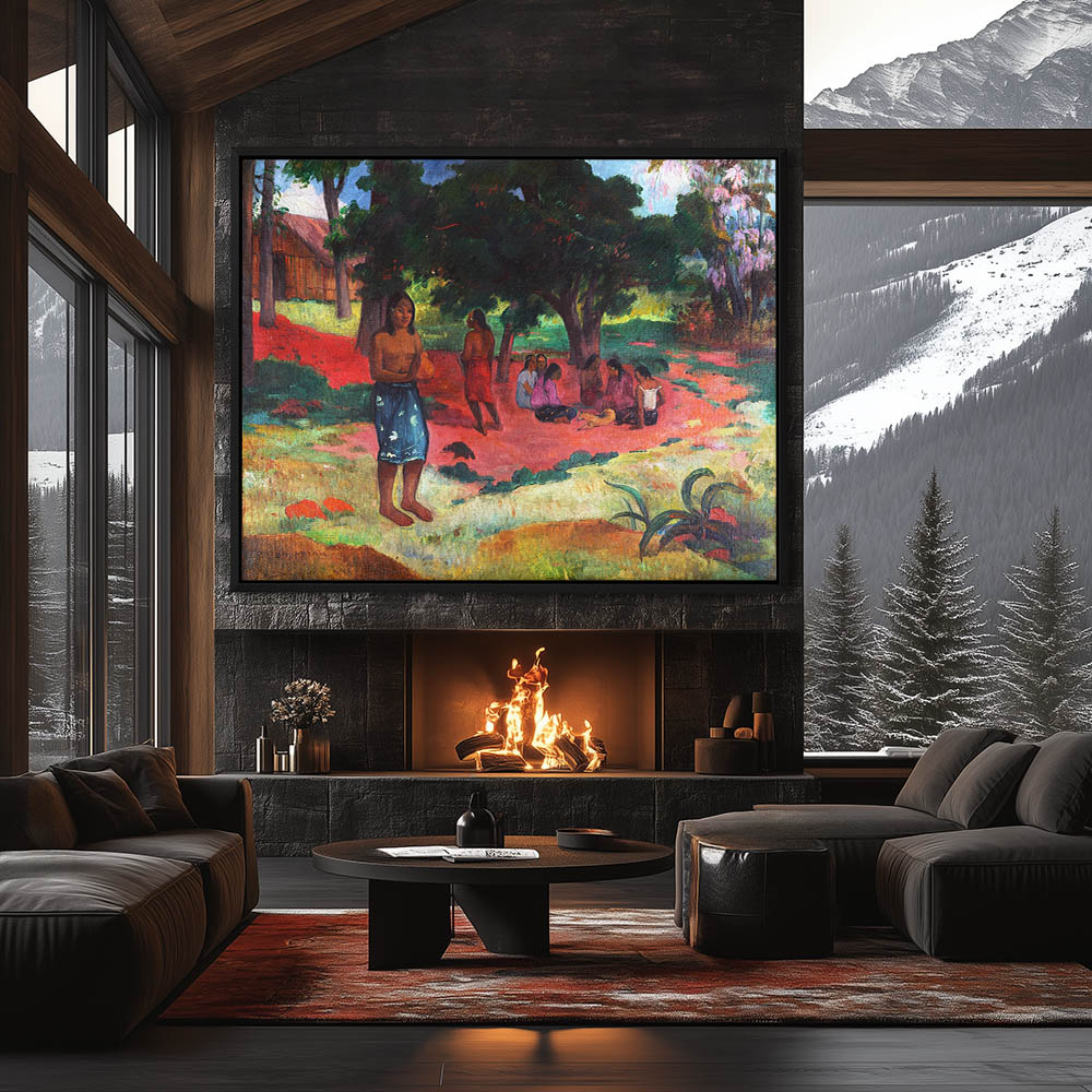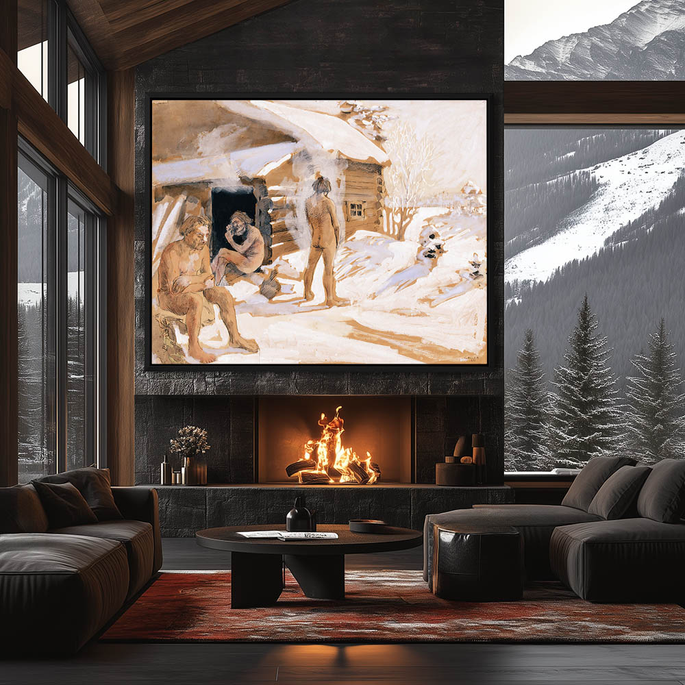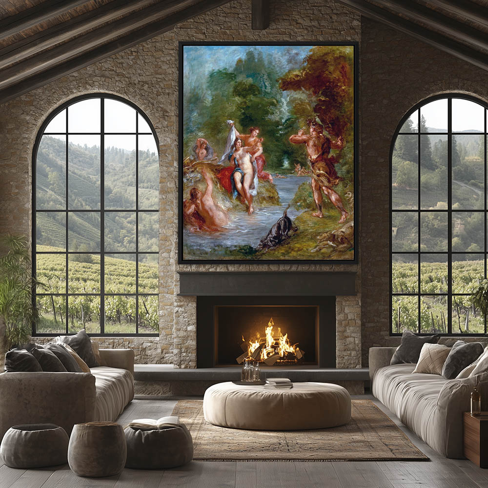 Vintage Figurative River Landscape Painting with Swimmers in the River