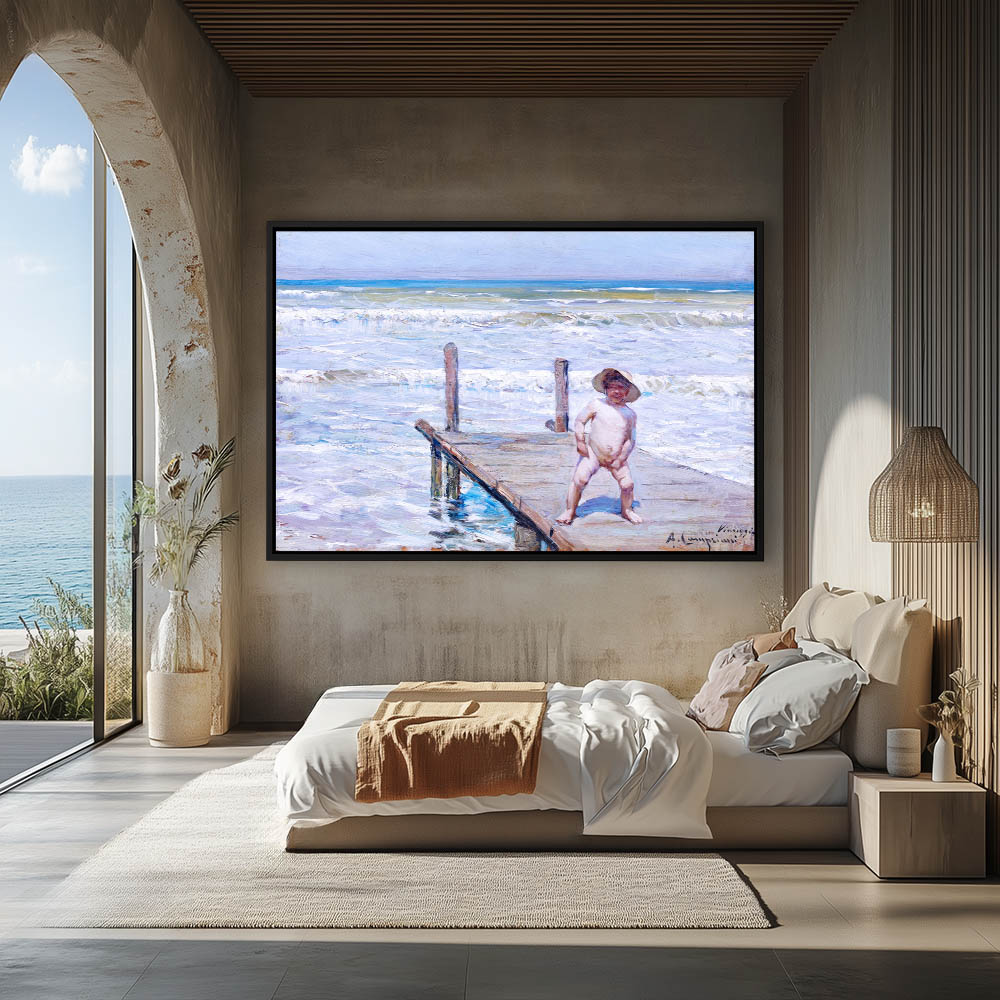 Coastal Painting with Waves and Young Naked Boy on the Pier