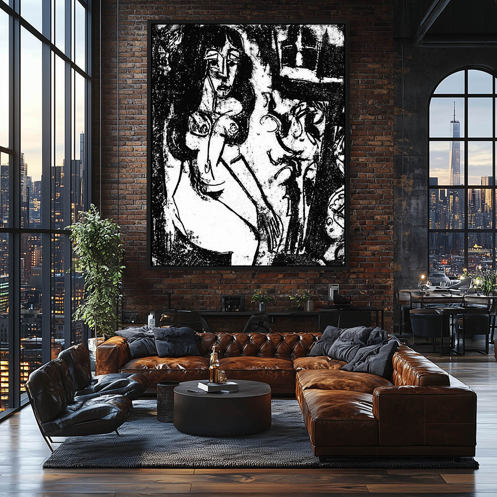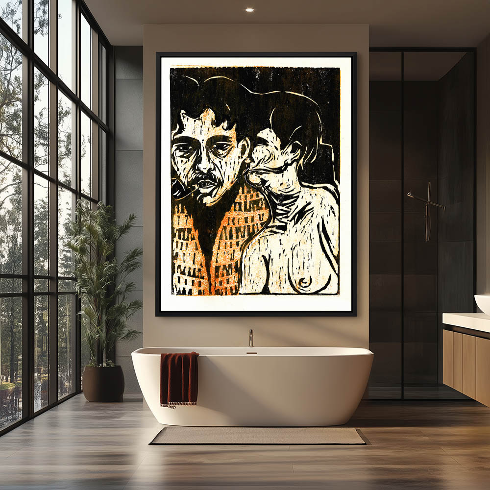 Print of a man smoking a pipe and a woman with her face turned into his neck