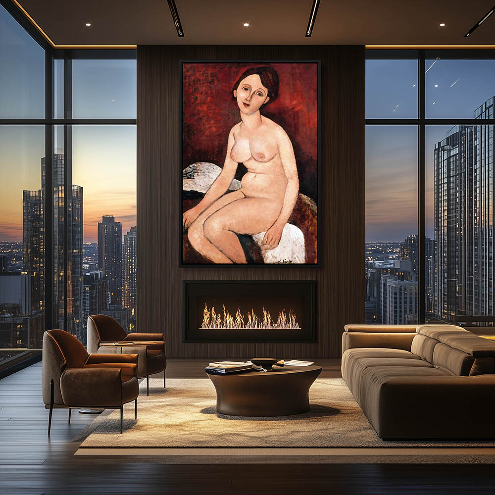 Abstract Figurative Painting of a Seated Nude Woman on Red Background