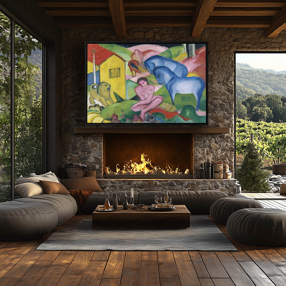 Nude figure in a fantasy landcape with mulitcolored animals
