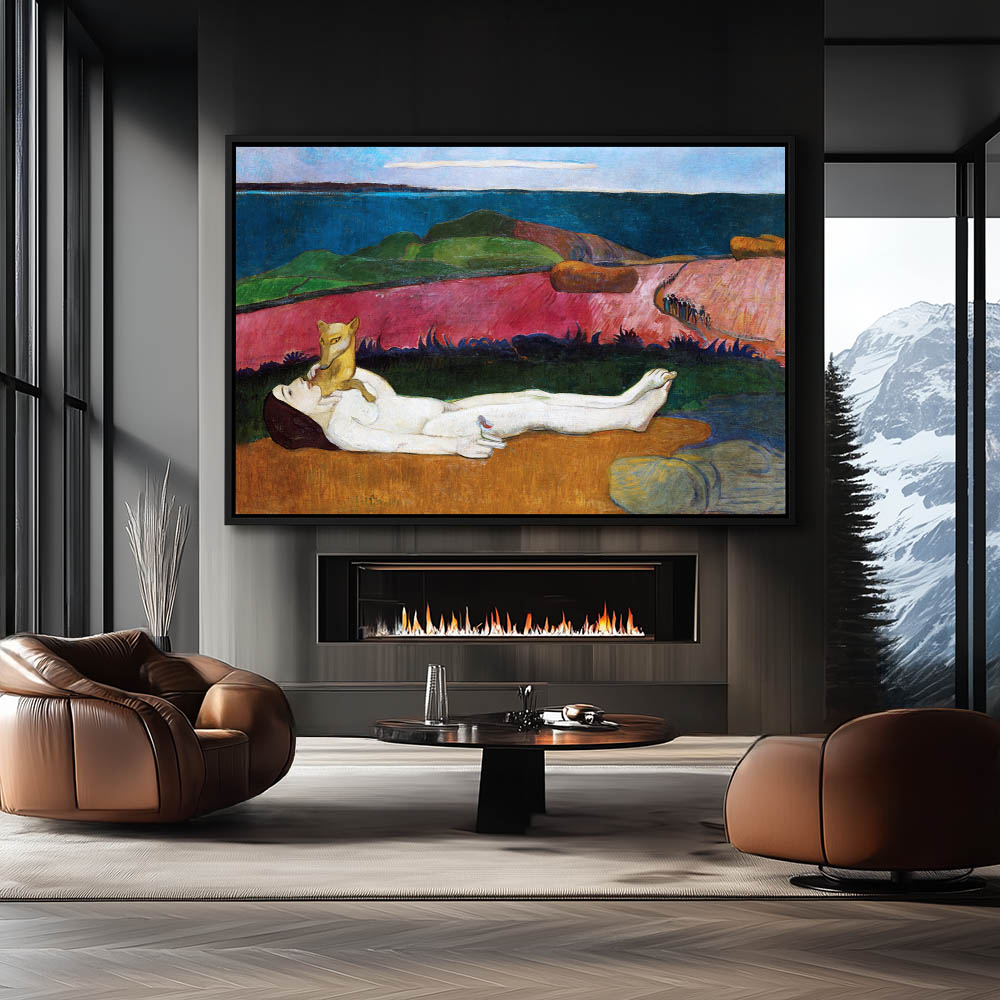 Vintage Abstract Landscape Painting with a Nude Woman and a Dog