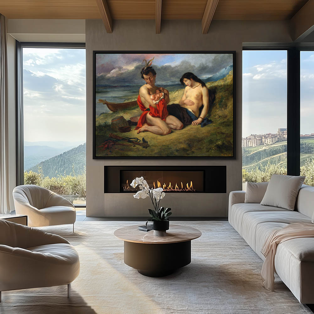 Vintage Figurative Painting with a Couple Resting on Shore with a Baby