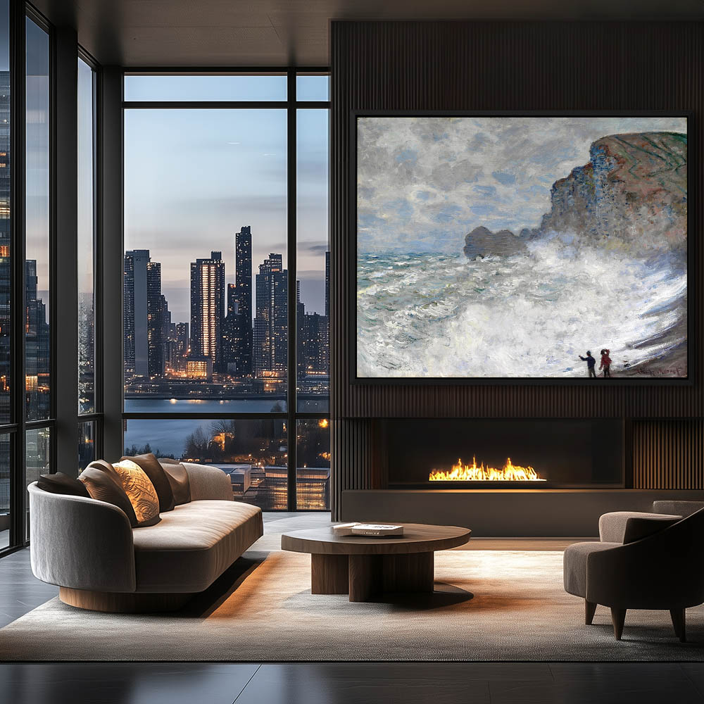 Seascape Painting with Rough Waves Hitting the Beach and Figures watching from Shore