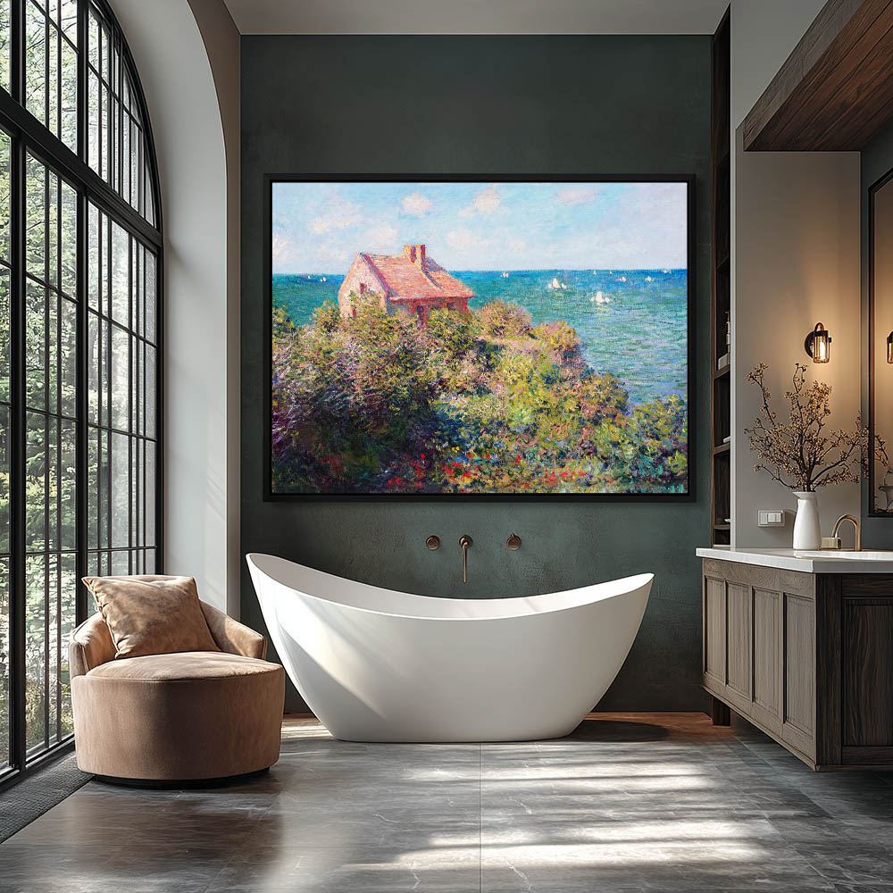 Vintage Seascape Painting with Cliffs on the Shoreline with a Cottage Overlooking the Sea