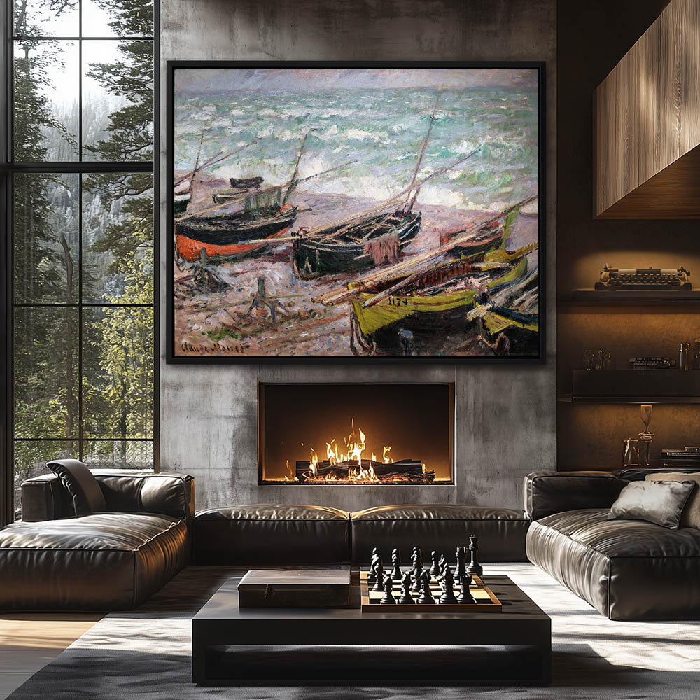 Vintage Seascape Painting with Fishing Boats on the Beach