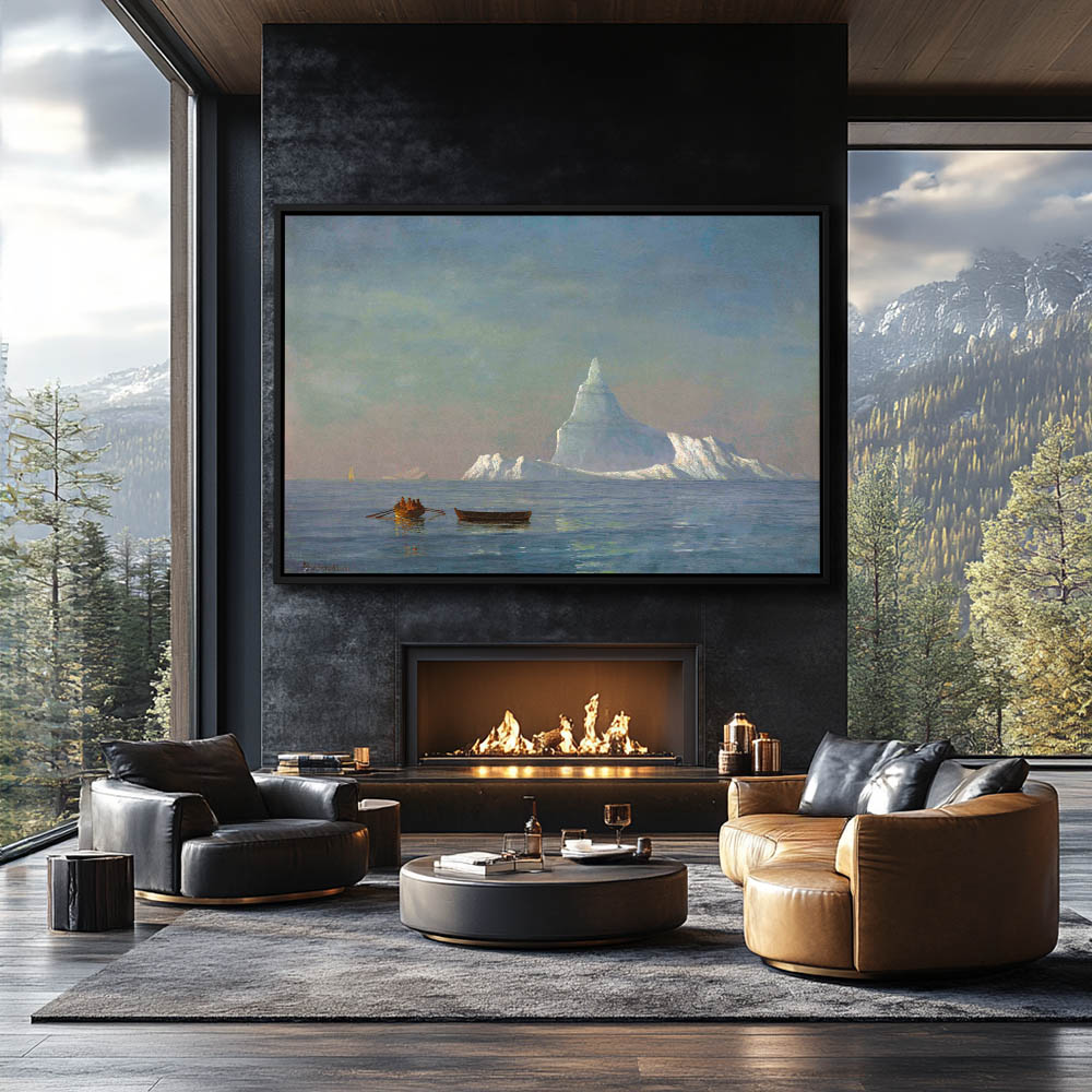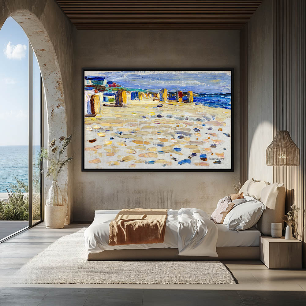 A woman, nude, with outstretched arms, stands on a beach as the tide comes in