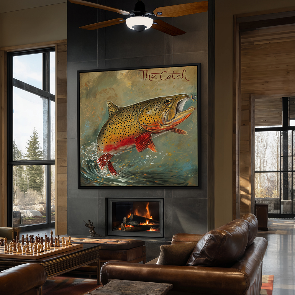 Fishing with a Trout Jumping for a Fly, Sold in Metal Wall Art, Stretched Canvas, Framed Prints, Fine Art Prints, Poster Art, Vinyl Wall Peel, Framed Canvas Wall Art, Framed with Floater Frames